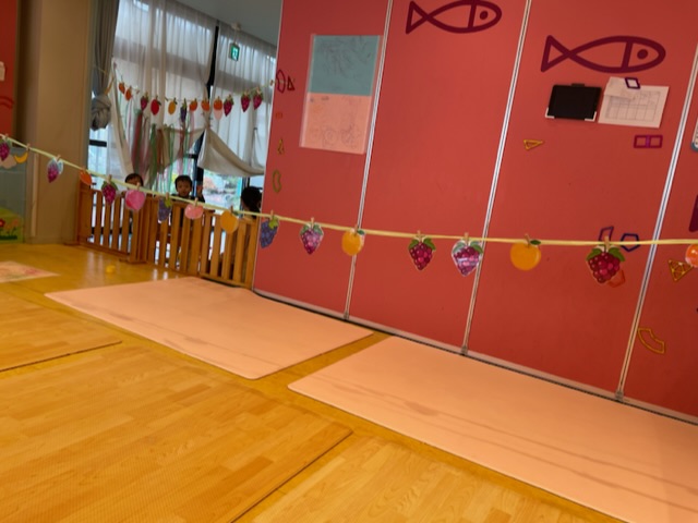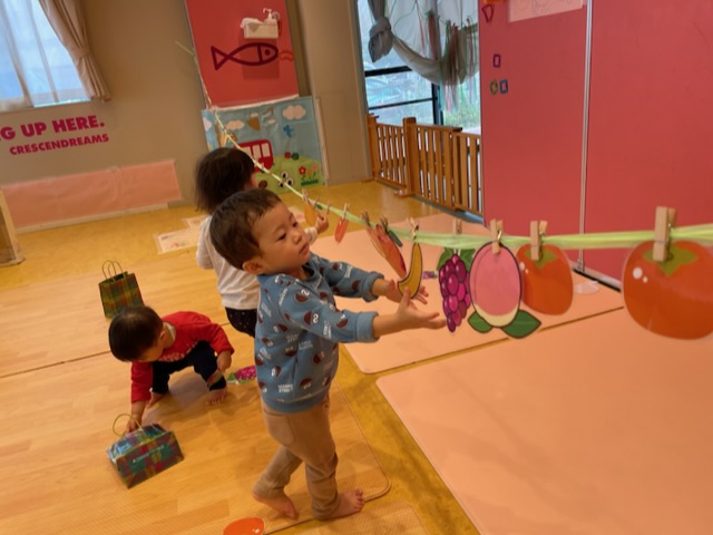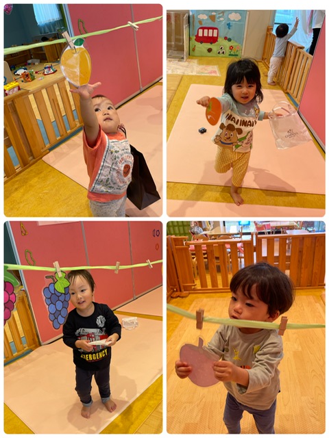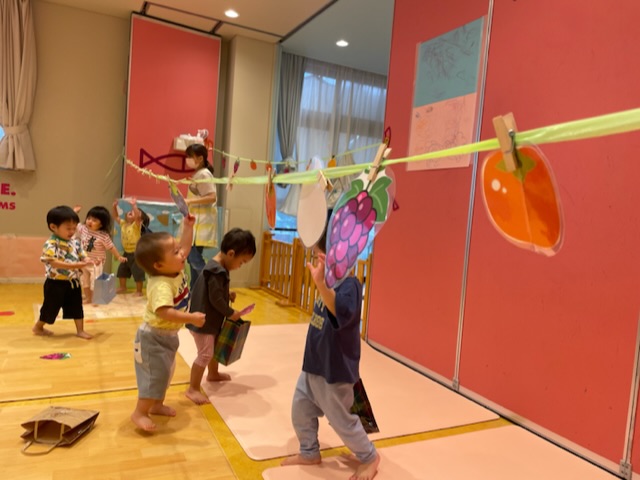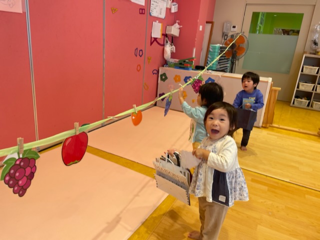 秋ならではの遊びとして、うみ組(1歳児)のお部屋でくだもの狩りごっこをしました。