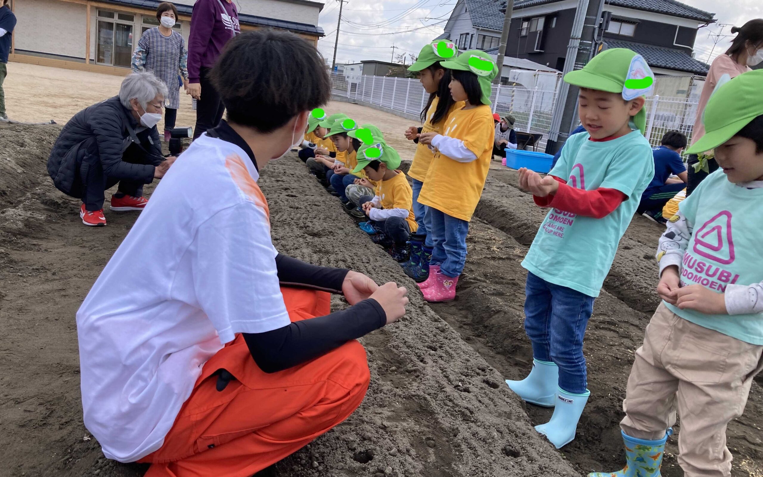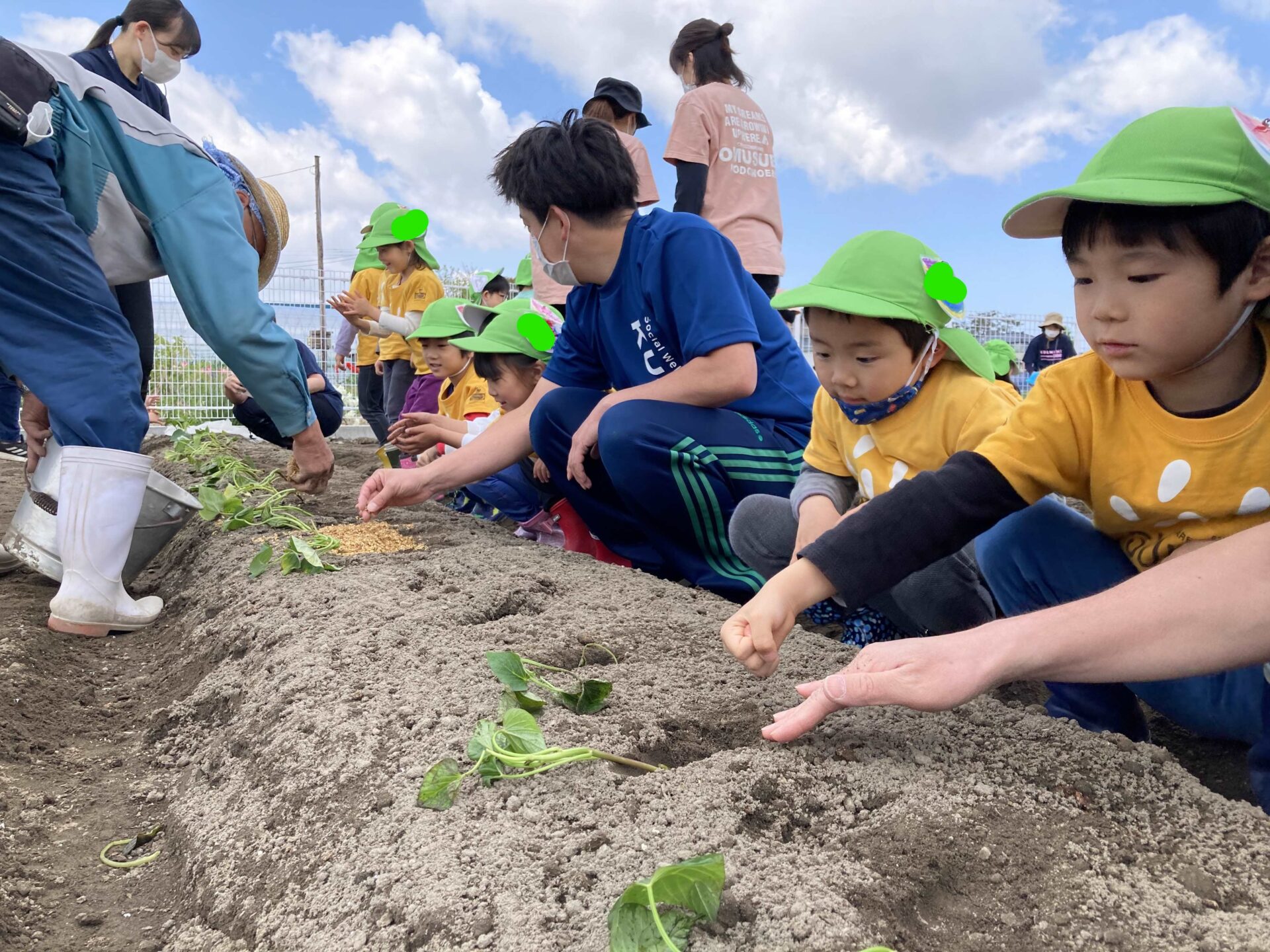 「そっと置くんだよね」「早く、お芋できないかな?」子どもたちの苗や、種への思いがあふれる言葉が聞かれました。