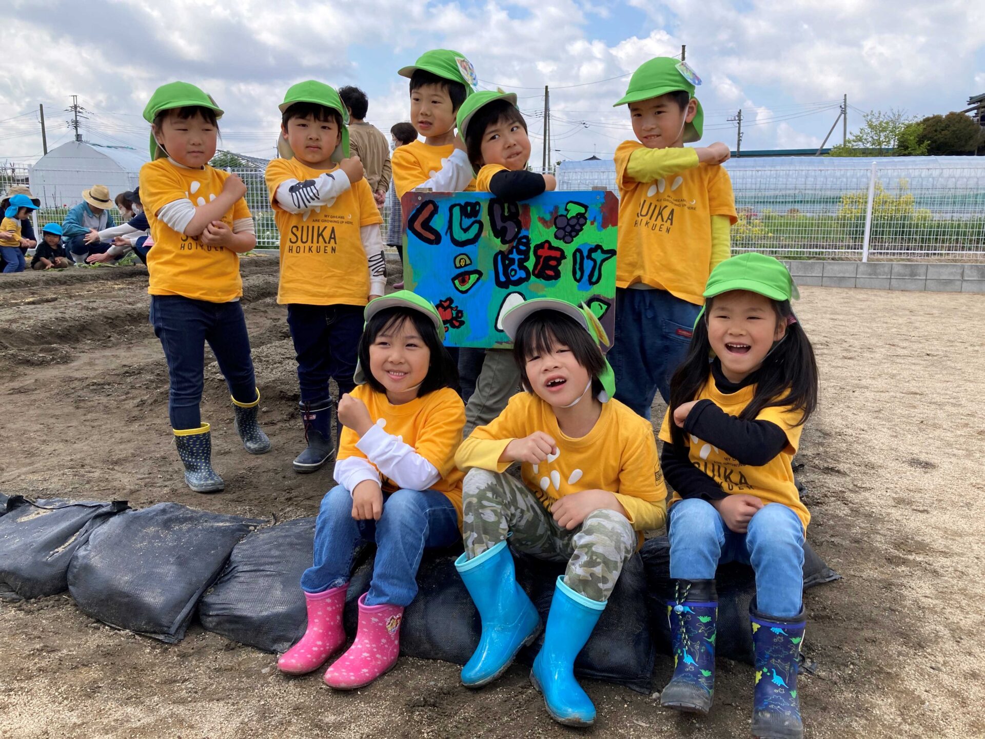 《パワー❕》のポーズを合言葉に、早く苗が育つようにと、子どもたちは自分の植えた苗に、パワーをたくさん送っていました。