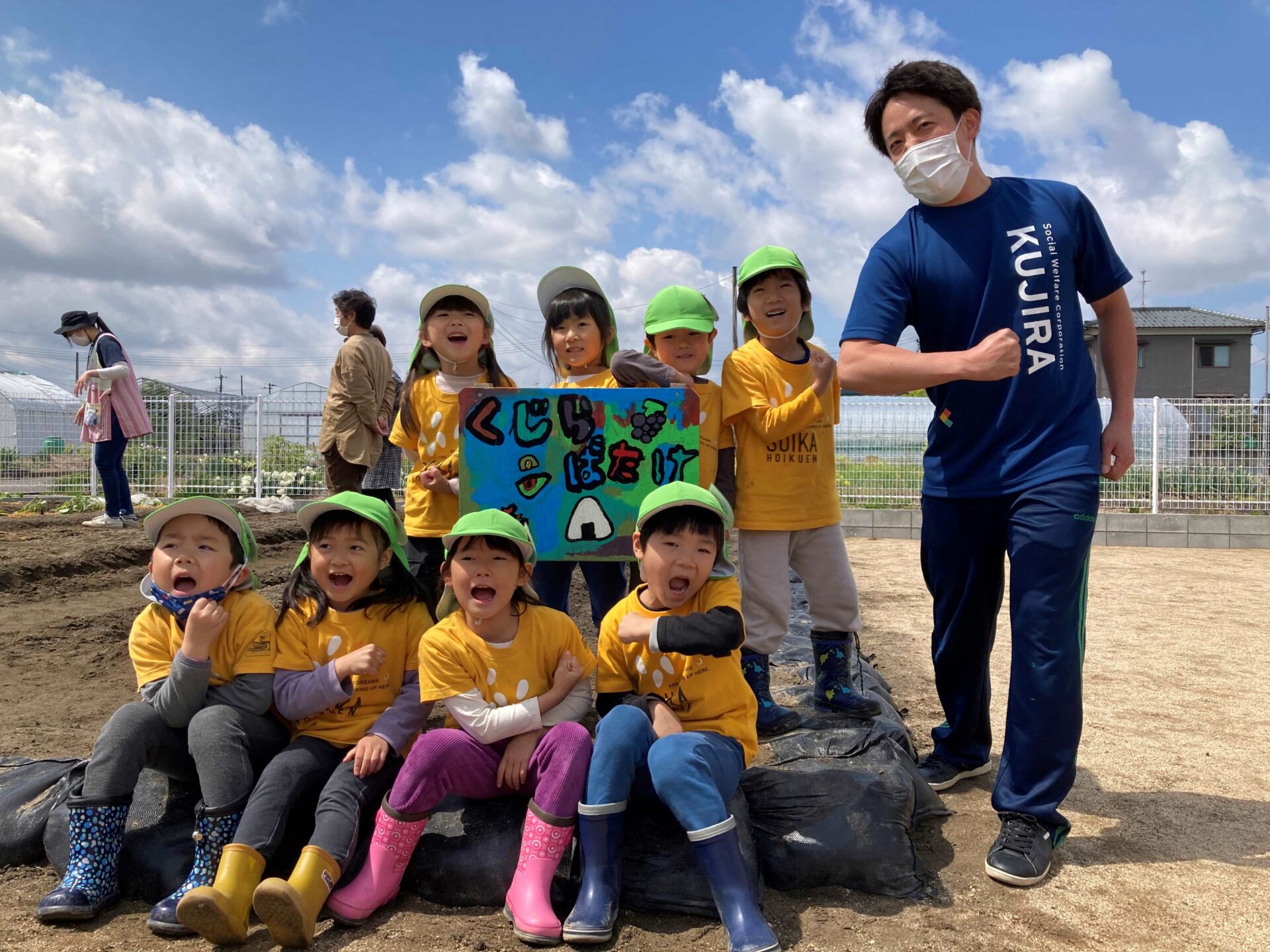 法人内の男性職員もお手伝いに駆けつけて、和気あいあいとした雰囲気の中、サツマイモの苗と、えだまめの種まきが始まりました。