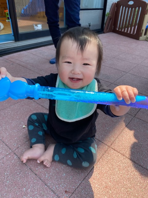 シャボン玉を飛ばすと、目で追ったり、手を伸ばしたりして、興味を示してくれています💡