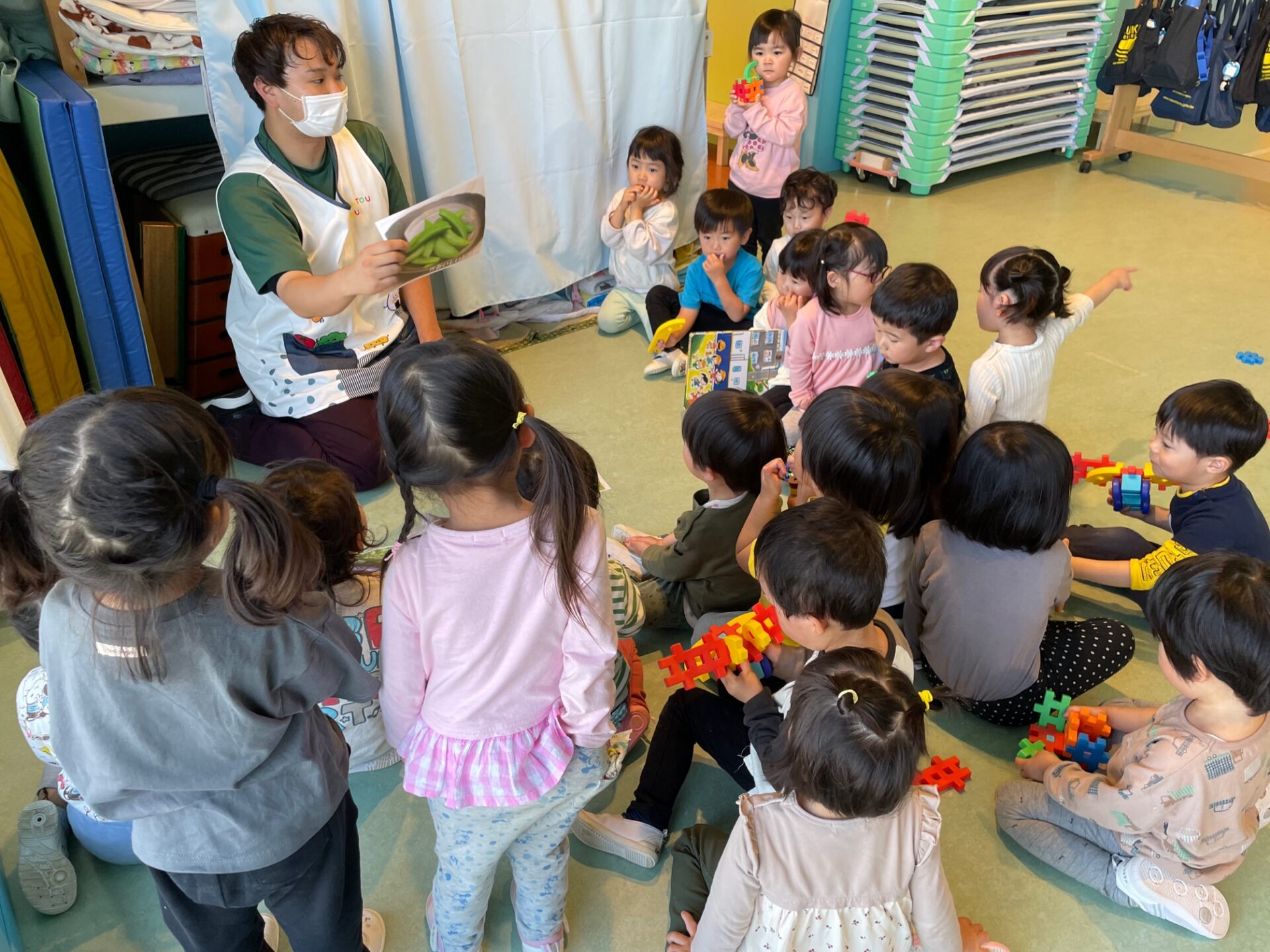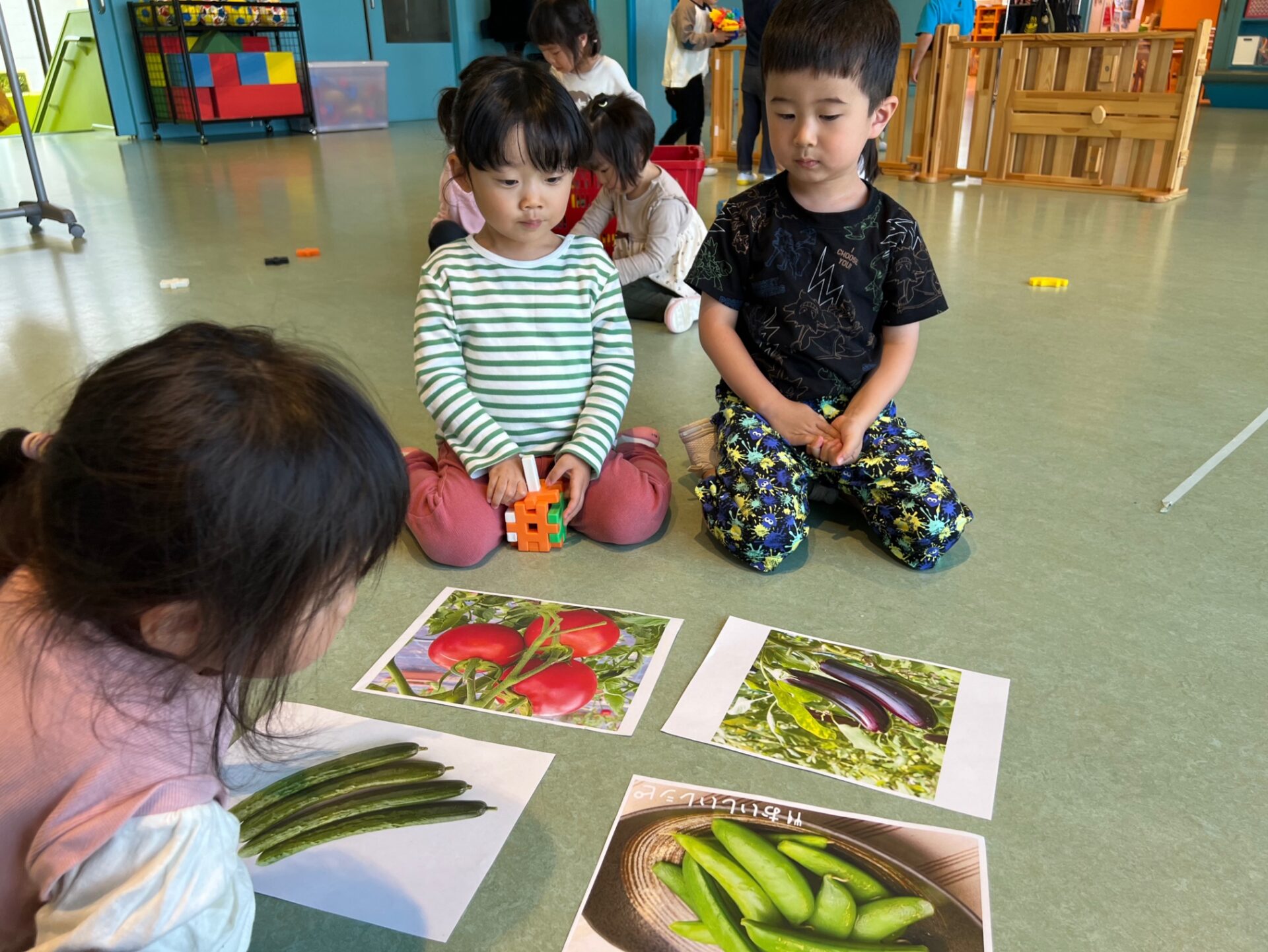 トマト、なす、きゅうり、いんげん(豆)の写真を見せると、子どもたちは、「豆がいい!!」と言い、今年ゆき組で育てる夏野菜は、【いんげん】に決定しました✨