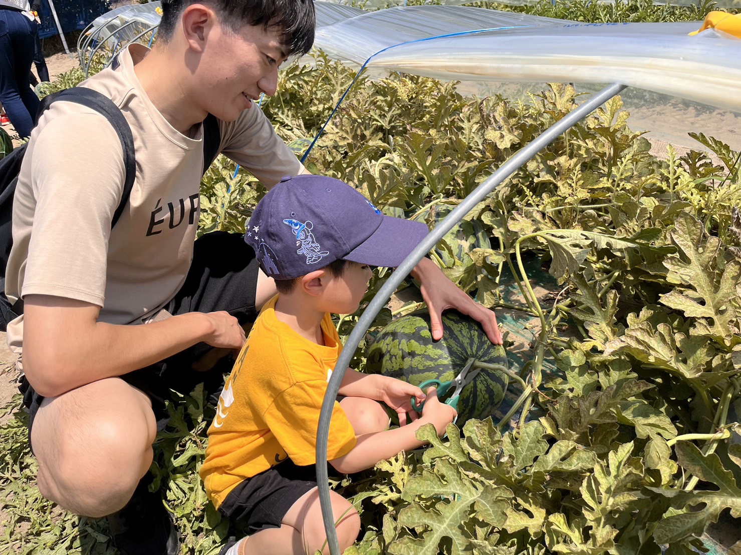 子どもたちは、たくさん実っているすいかを前に、どれを収穫するか迷っていました。