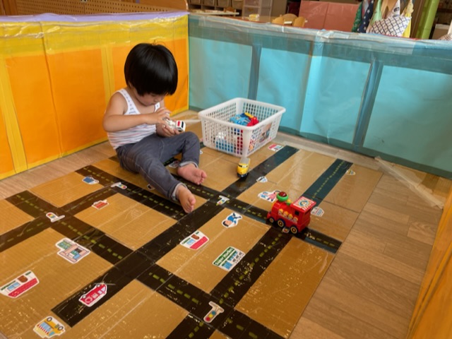 道路マットの上に、車を走らせて遊んでいます!