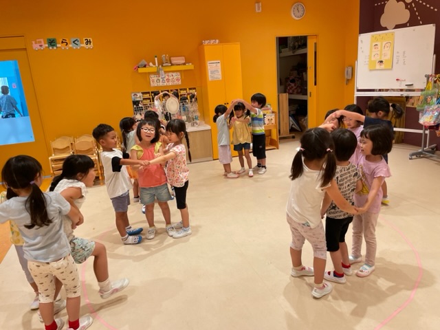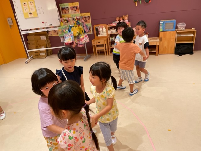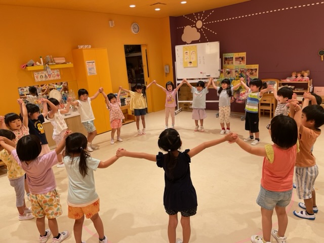 この、ふれあいあそびでは、少しずつお友だちの人数が増えていく喜びや楽しさ、一つの大きな円になった時の一体感を、子どもたち一人ひとりが感じているようでした!