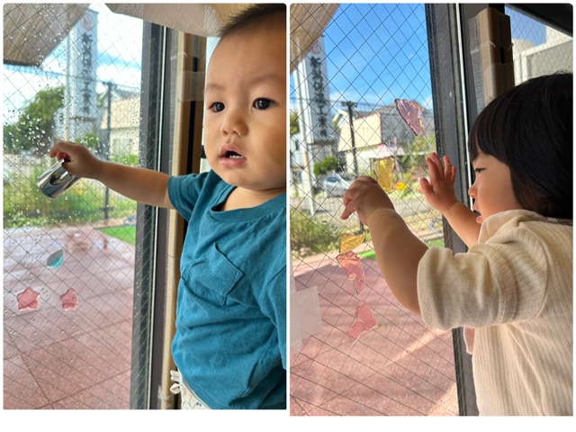 窓ガラスにぺたっ😄キラキラしていてキレイだね。