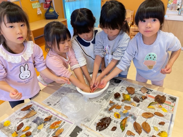 あそびから、秋の自然物に触れることで関心を持ったり、季節の変化を実感したりすることができました。また落ち葉あそびでは、落ち葉の色や形、質感を感じながら、表現することを楽しんでいました。