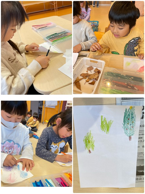 また、擦り出した葉っぱにお絵描きをして“クリスマスツリー“に見立てる子もいました🎄