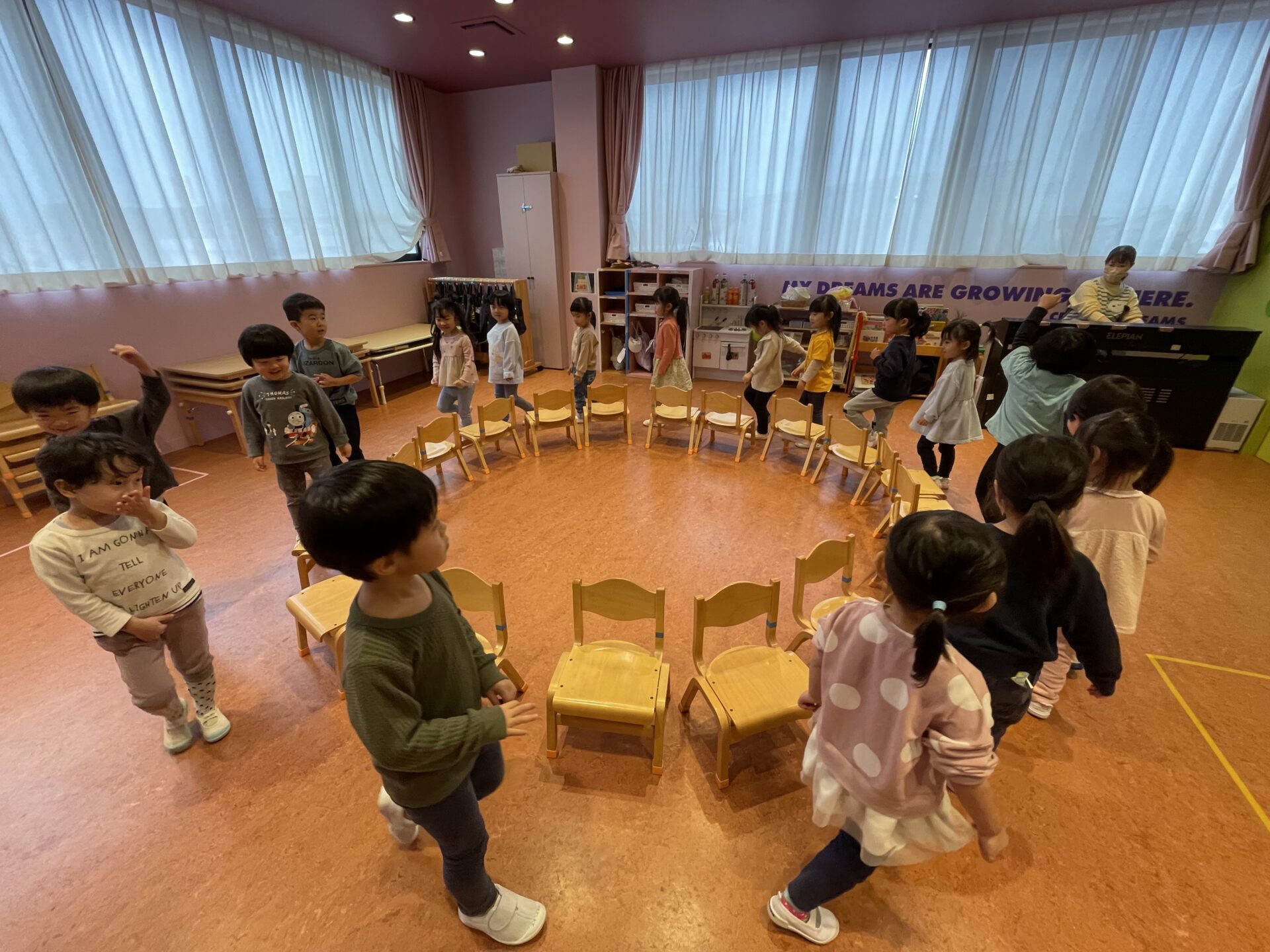 ピアノの音をよく聞いて、空いている椅子はどこかよく見て、全身と五感を使って遊びます。