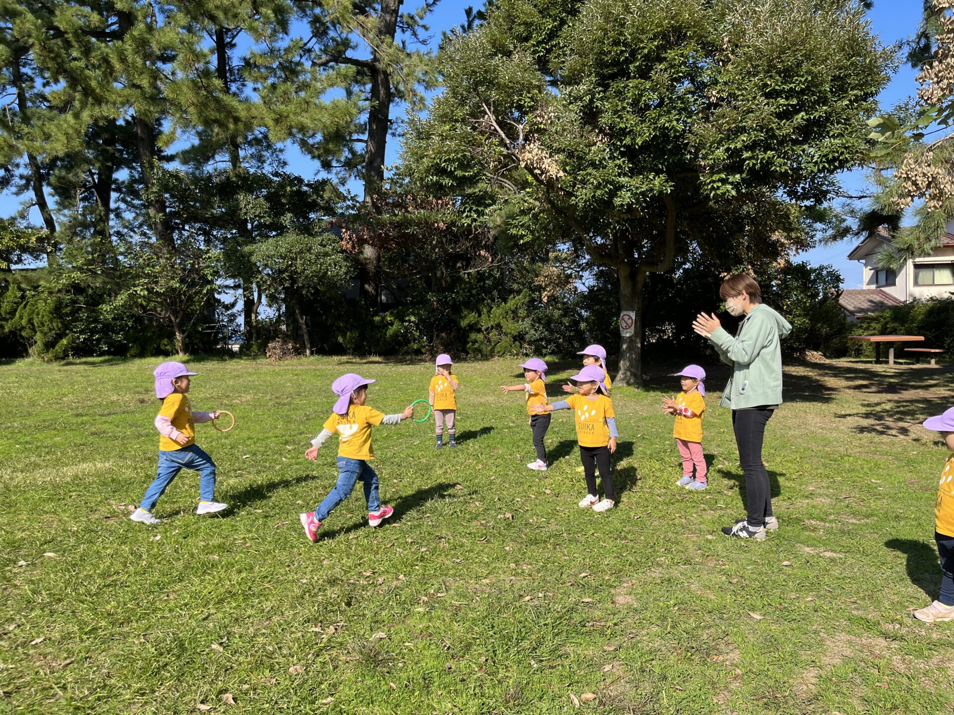 あの後、広い公園へバスで出かけ、園庭よりも長い距離でリレーをしました!
