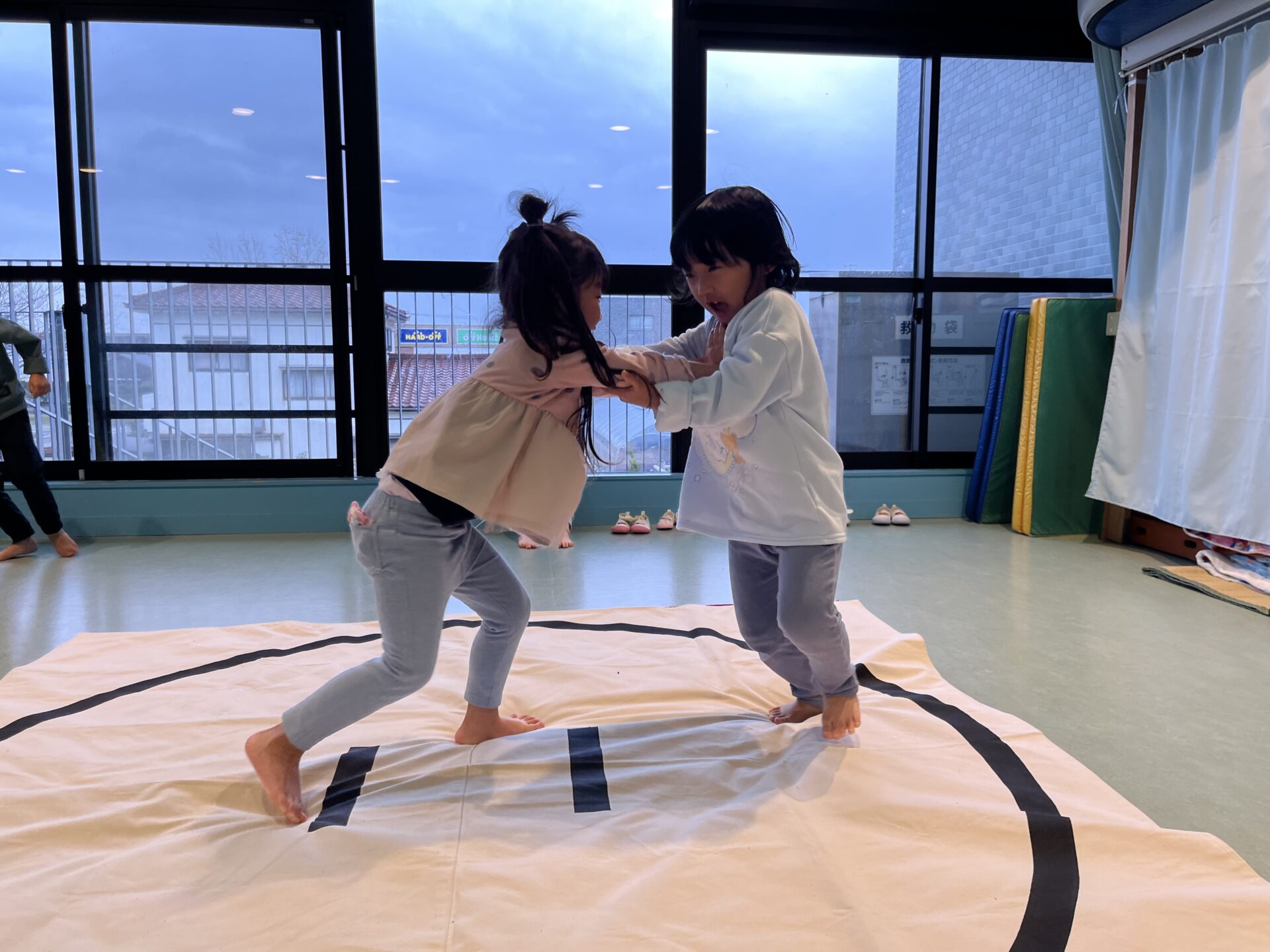 集団あそびではありませんが、お相撲ごっこやトランポリンなど、室内で体を動かすあそびをいろいろしています。