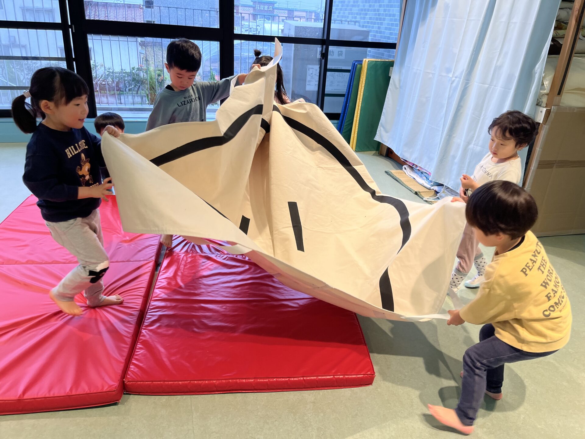 盛り上がっている集団あそびを室内でも楽しめるよう、工夫しています。