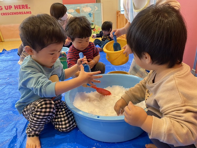 園庭だけではなく、保育室でも雪あそびをしました。
