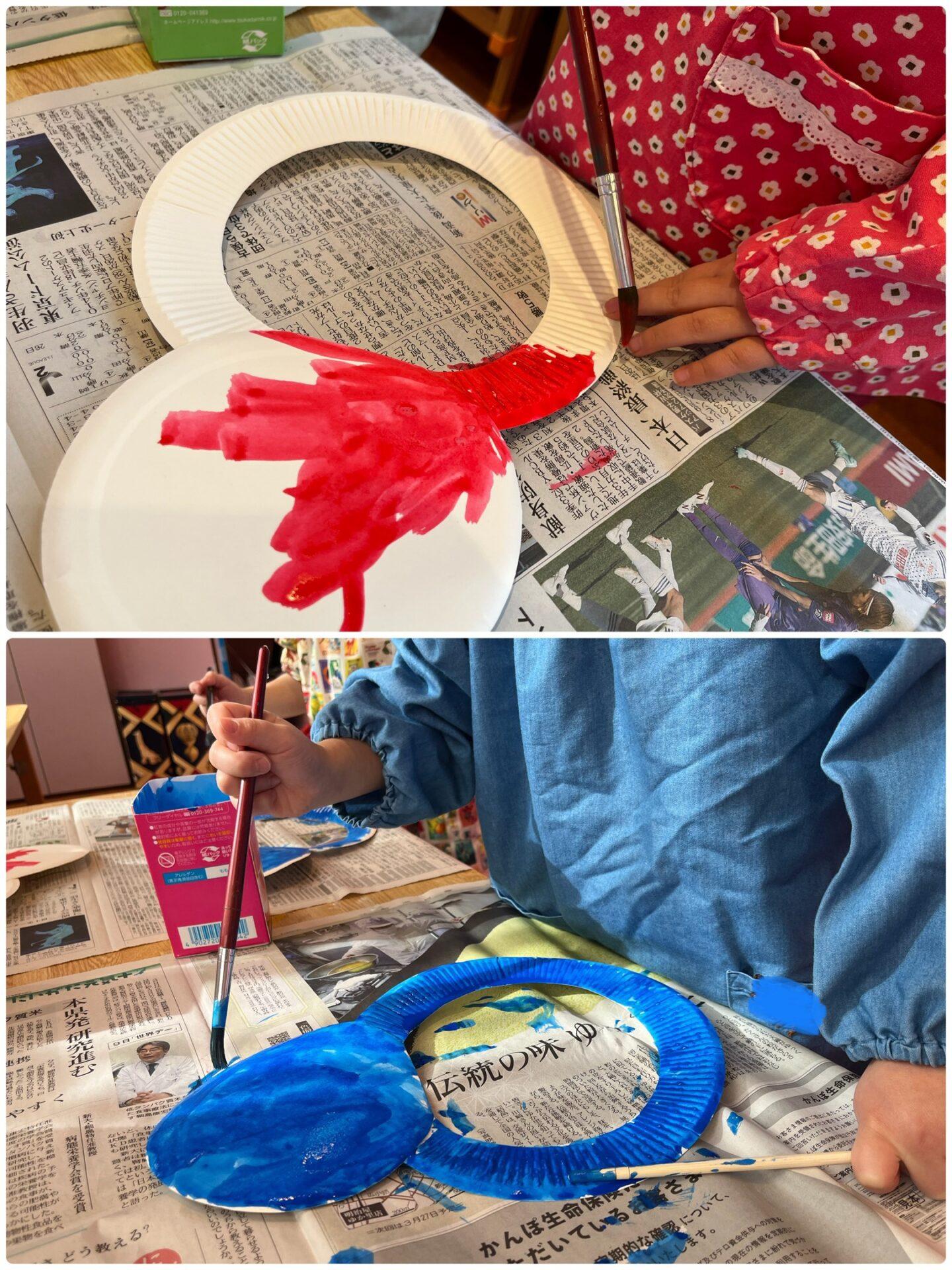 こちらもまずは絵の具で色塗り。赤・青・黄・緑と4色用意し、好きな色を選びました。