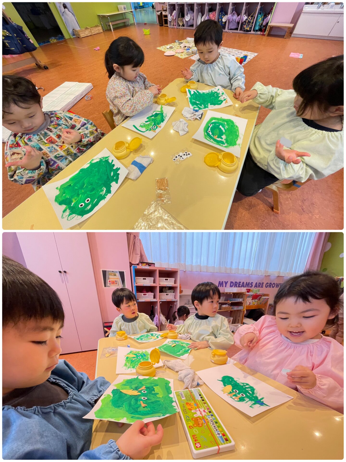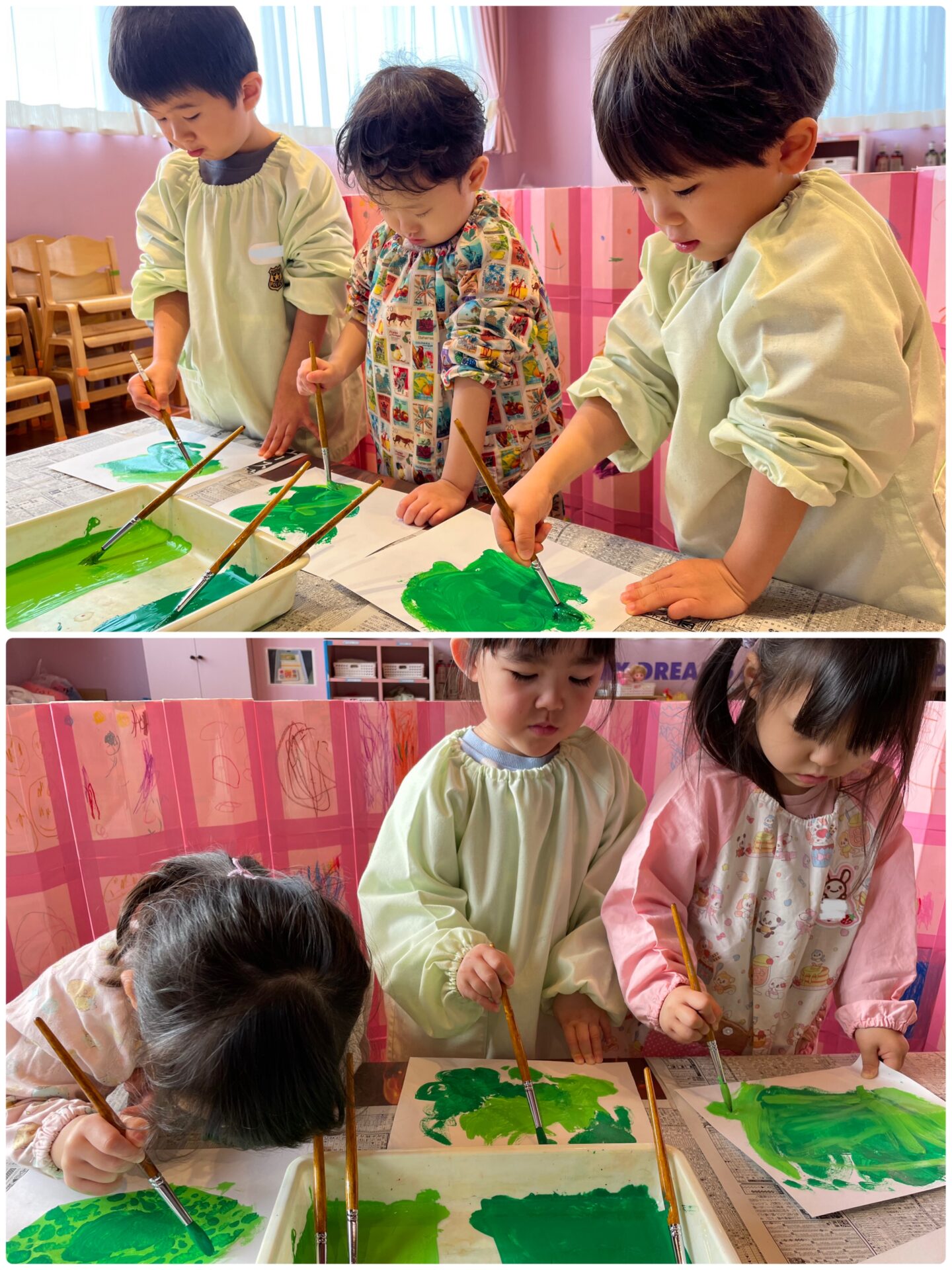 最初に、白い画用紙に絵の具で色を塗りました。絵の具は、濃淡2種類の緑色を用意。色の違いに気がつく子、混ざり合う様子を楽しむ子など、様々でした。