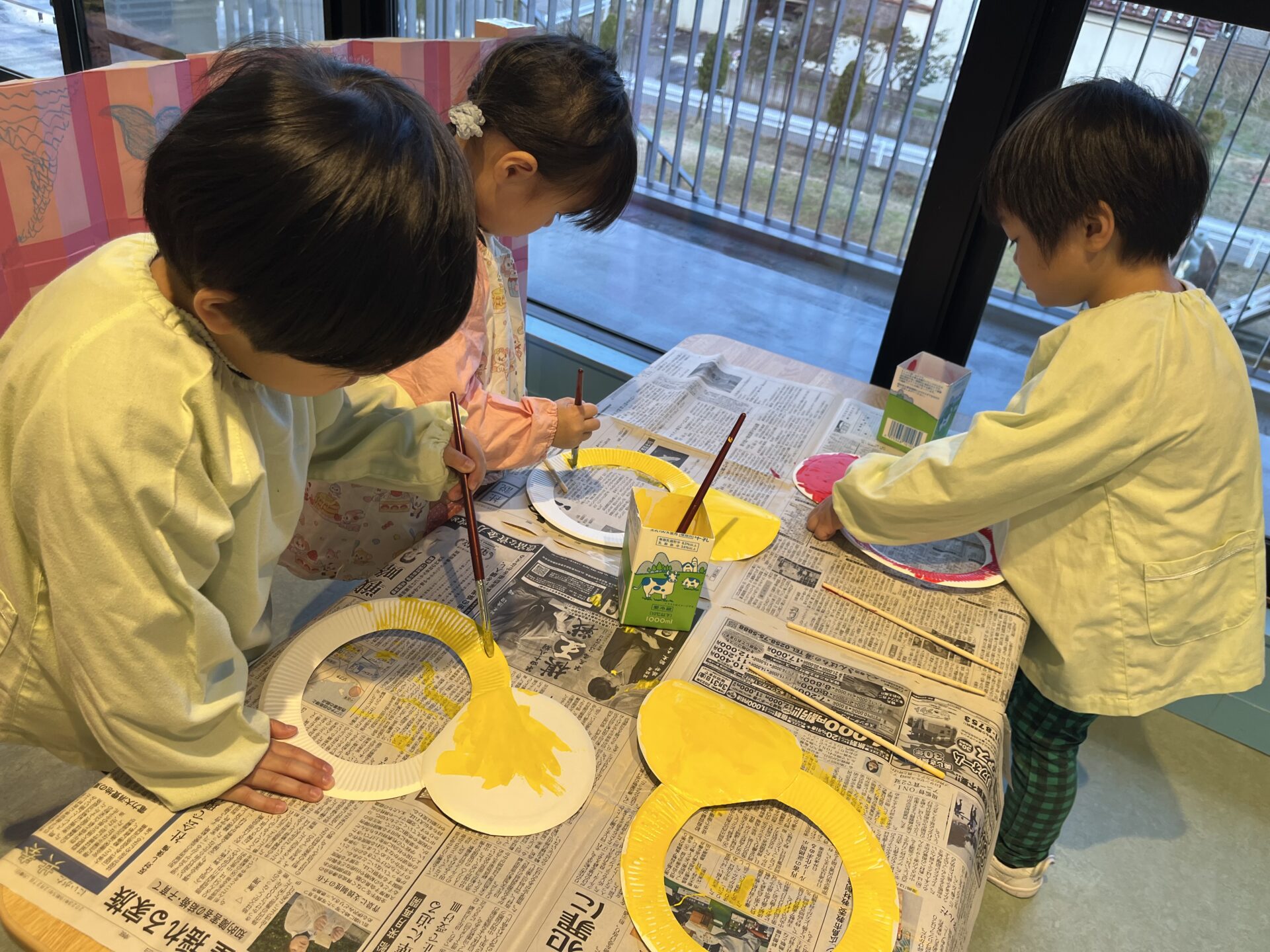 塗り進めるとおさえる部分がなくなっていくので、「手に絵の具がついちゃう」と子どもたち。割り箸を用意して、これでおさえたら?と提案すると、器用に使っていました。