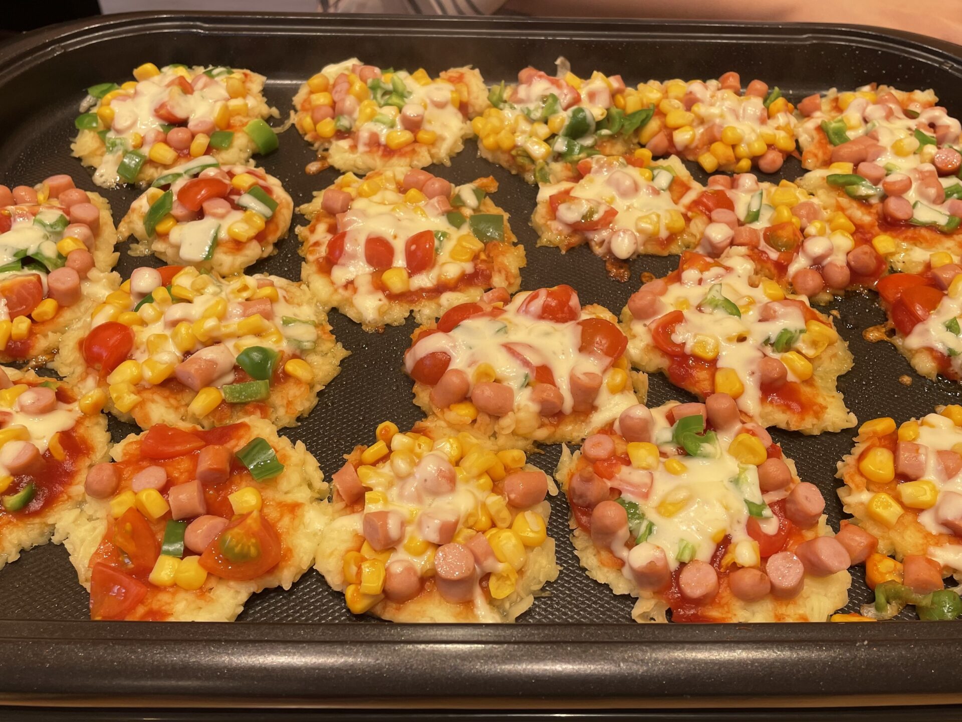 仕上げにチーズを乗せ、ホットプレートで焼きました😊