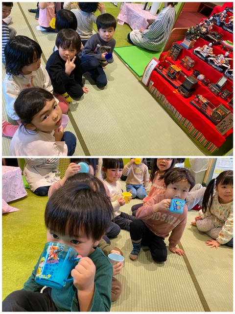 ひなまつりのお祝いに、3〜5歳児が保育園の玄関前に飾られているひな壇を眺めながらカルピスでカンパイ!