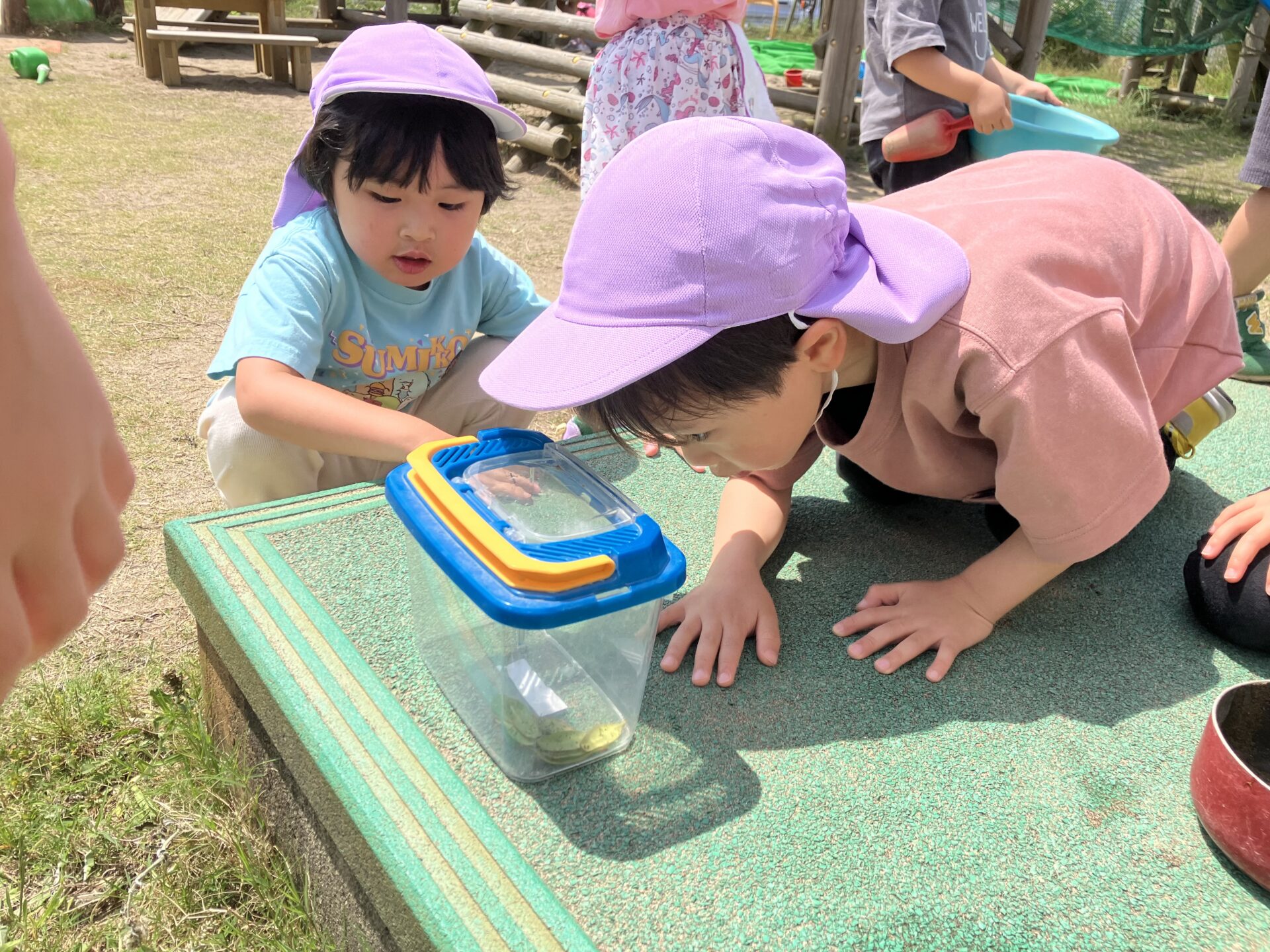 暑い日が続き、いよいよ夏も近づいてきています😊元気いっぱいな、そら組(4歳児)は、そんな中でも外が大好き!戸外活動を通して生き物や植物に興味を持って楽しく触れ合っています。