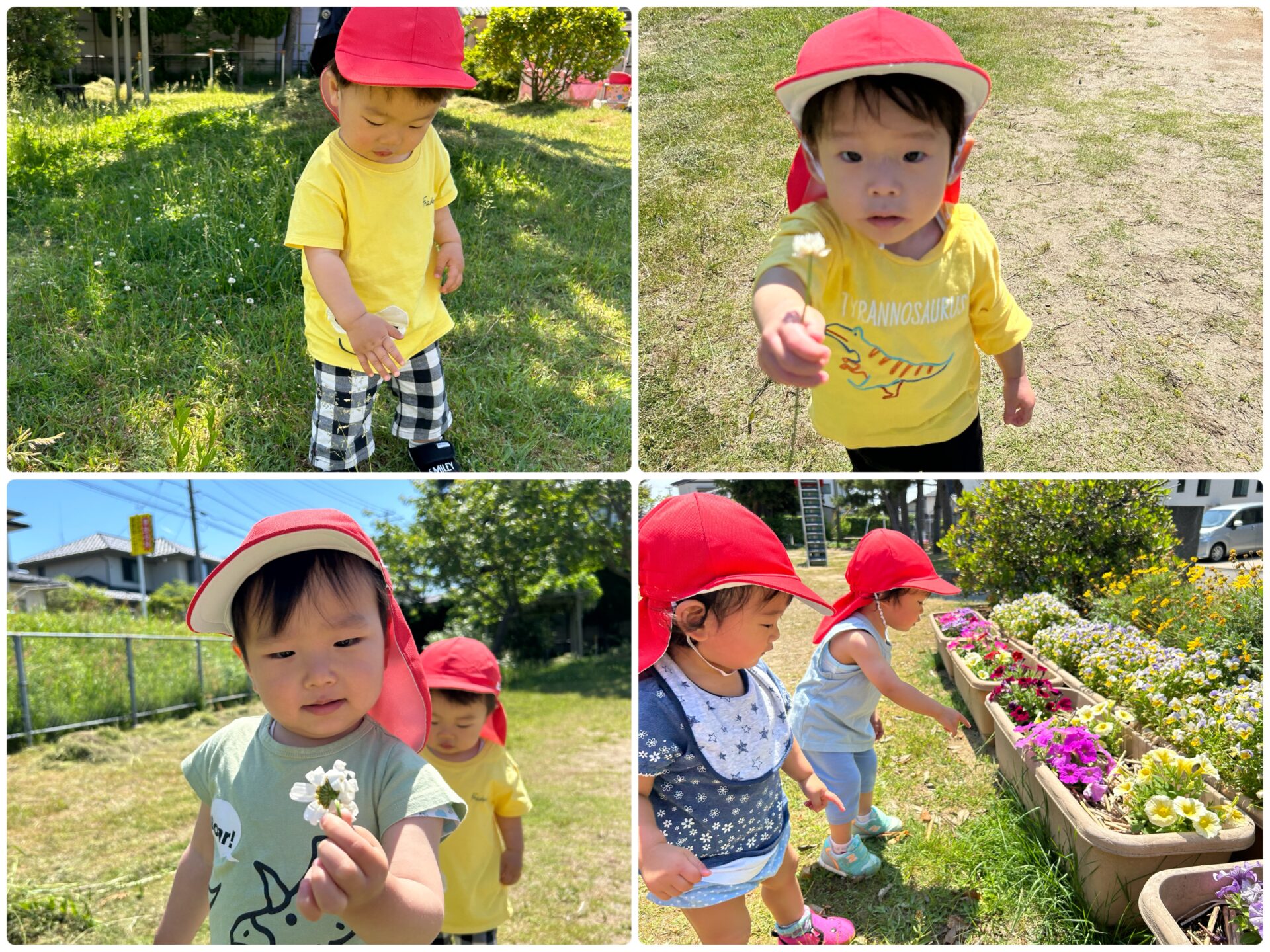 公園では、葉っぱやお花などの植物にふれて感触や色を楽しんでいます🌼