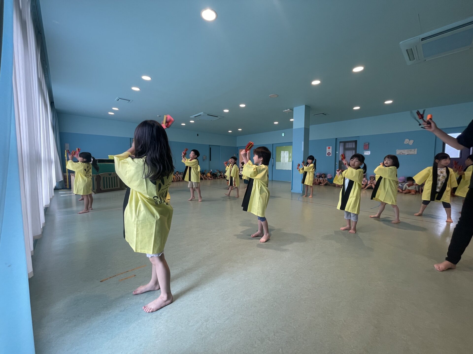 今日は、ふれあいデーのリハーサル。始まる前から嬉しさで気持ちが舞い上がっていた子どもたちでした。その中でも、つき組(5歳児)は、オープニングのよさこいで着るハッピに腕を通すと、どことなく緊張した様子。