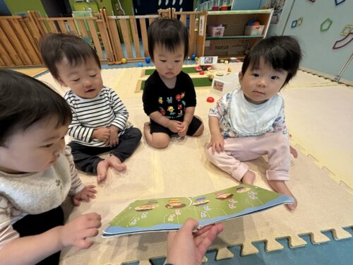 絵本の読み聞かせは、新しい言葉にふれたり、保育者とゆっくりかかわることができる時間になっています。