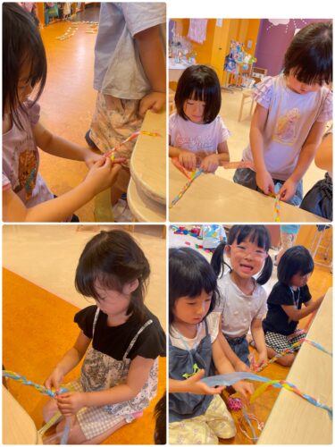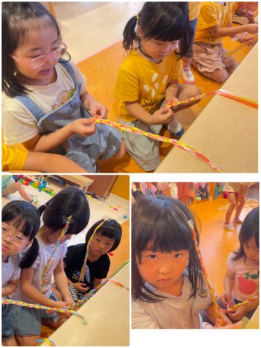 担任が三つ編みをして見せると女の子たちが「やってみたい!!」と興味を持ってくれたので、まずは3色のテープを使って三つ編みに挑戦してみました✨
