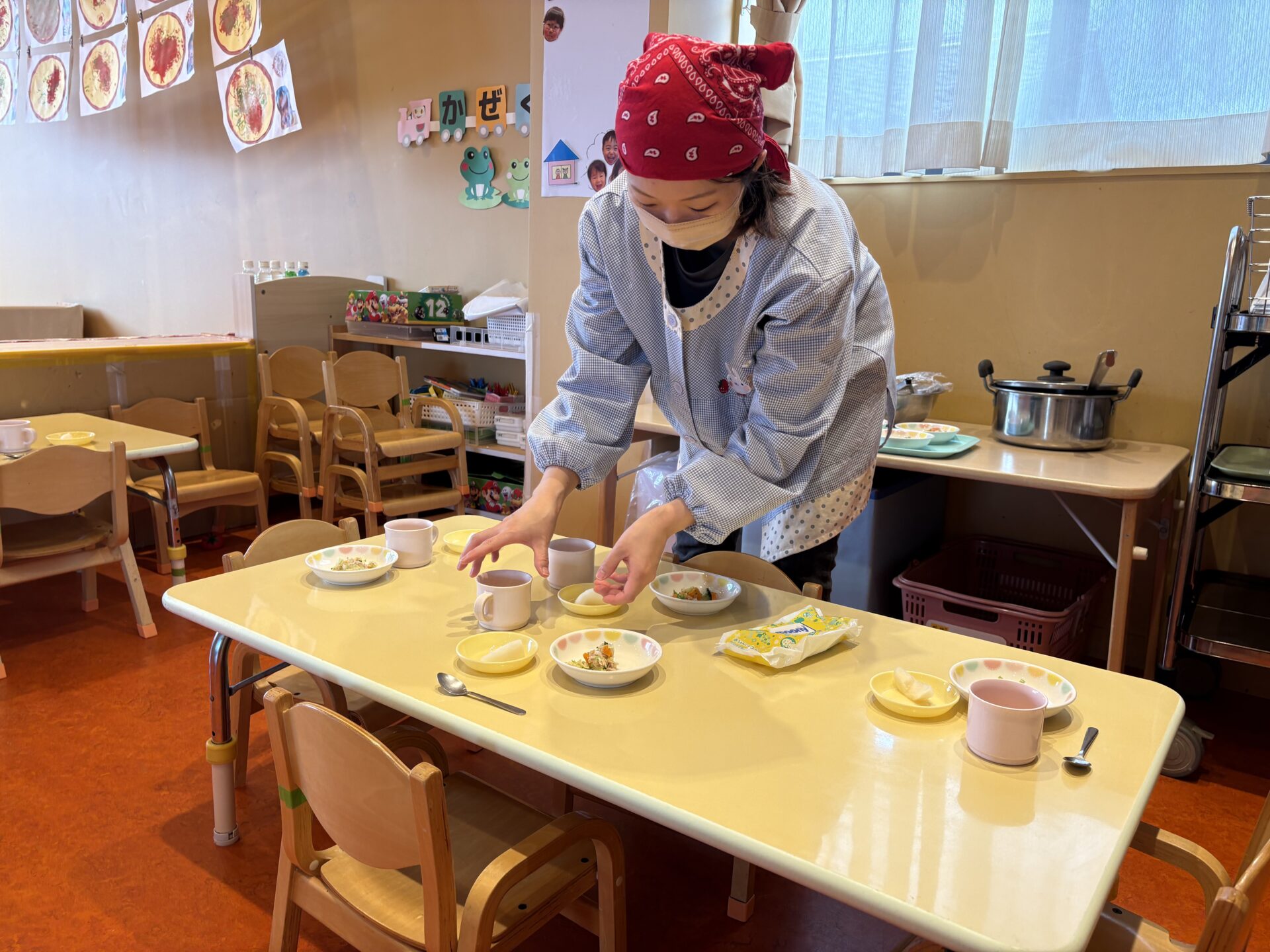 配膳担当の職員は、各年齢に合わせて子どもたちが食べられる量を盛り付けをしていきます。最近のかぜ組(2歳児)の子どもたちは、体力もつき、食べる量も増えてきました🍚この日のメニューは子どもたちに大人気のあのメニューなので、おかわりをするお友だちがたくさんいることでしょう!