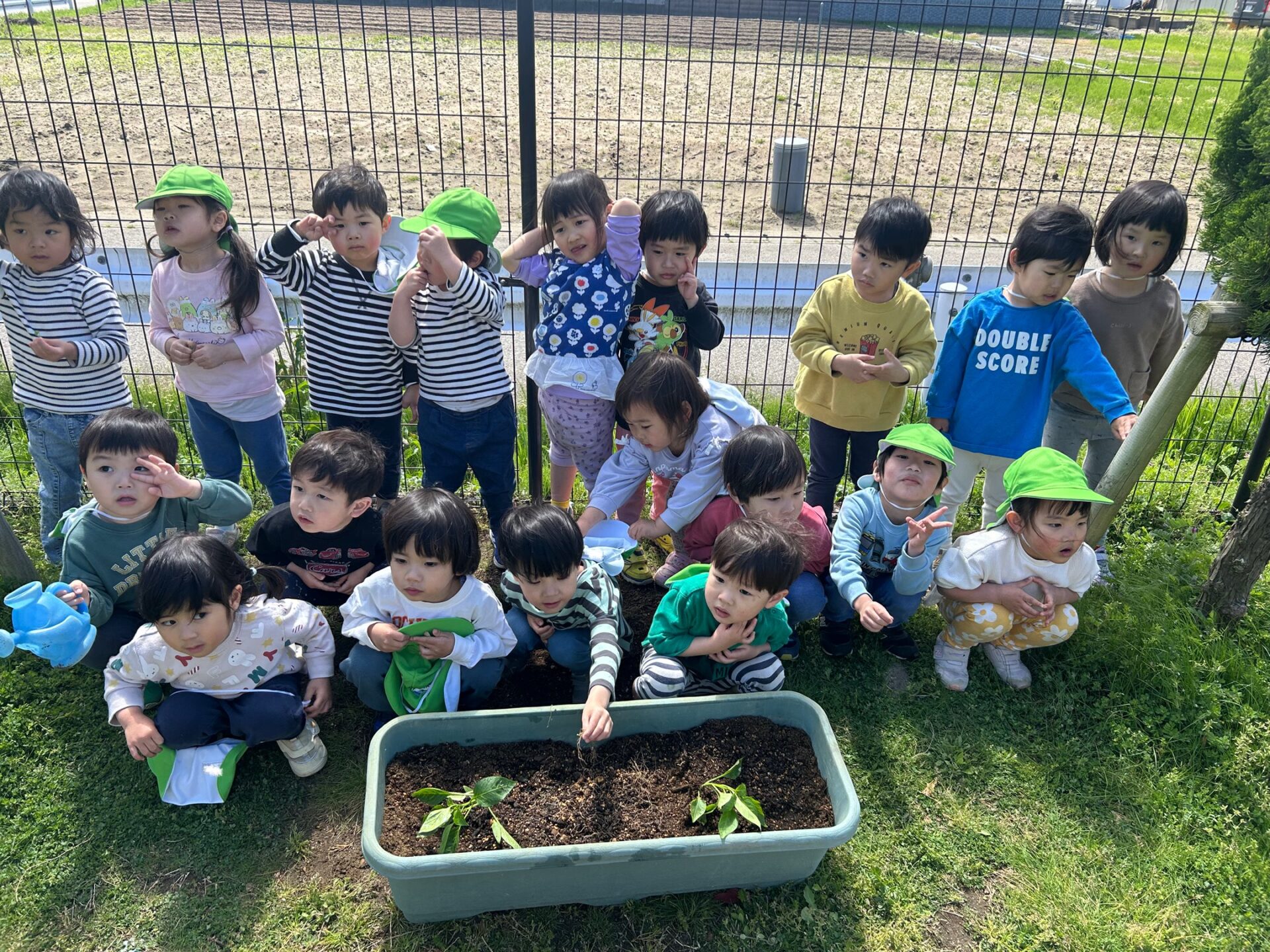 ピーマンの苗を植えてワクワクなゆき組の子どもたち。