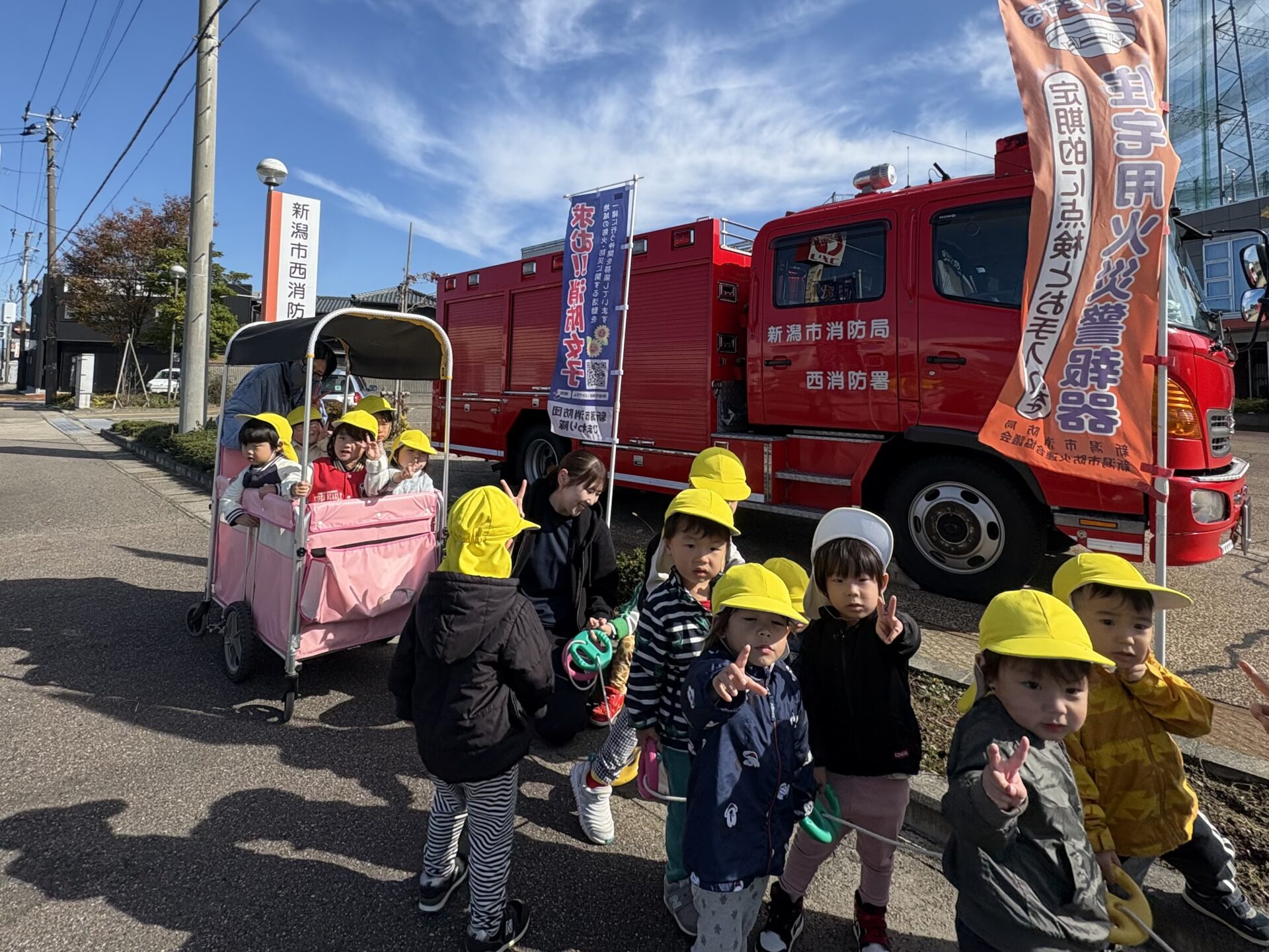 そこで、天気の良い日を見つけて、すいか保育園の近隣にある”消防署”へ行くことに!!