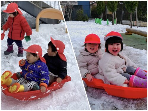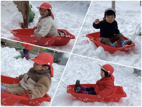 「せんせ〜早く走って〜」「次はぼくが引っ張る!」など、何度もそりに乗ったり保育者と一緒にお友だちが乗ったそりを引っ張っています😆