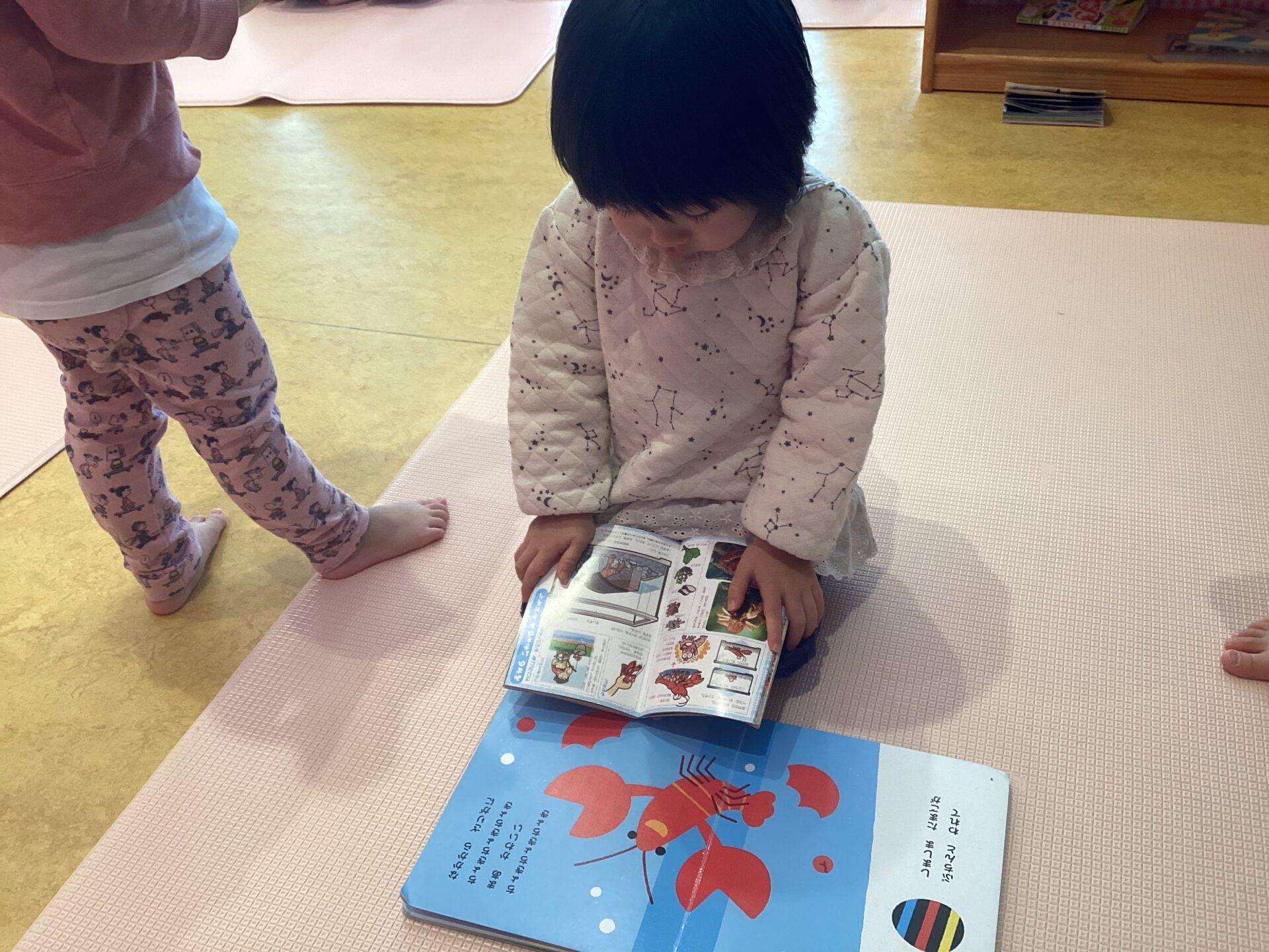 今月は、新しい絵本や図鑑を購入し、本棚がさらに充実しました!そこで保育者やお友だちと一緒に楽しんでいる様子をご紹介します。