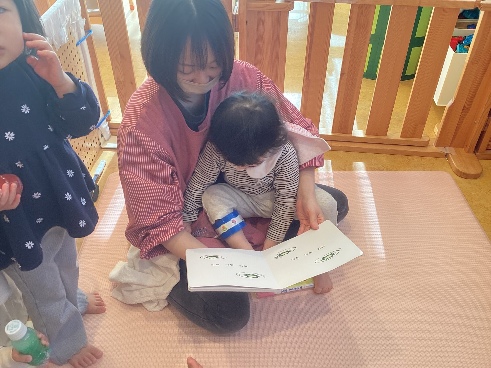 保育者の膝に座って大好きな絵本をゆったり楽しむお友だち。