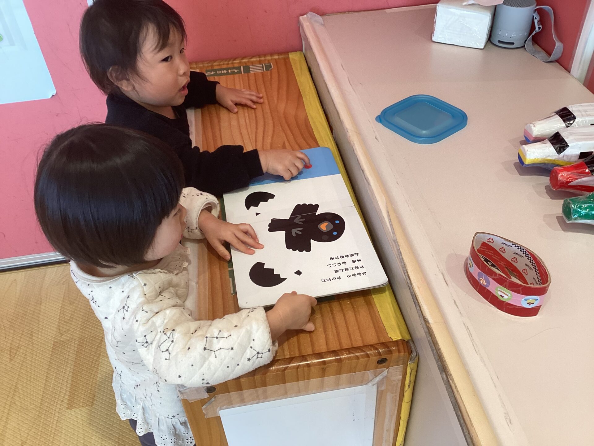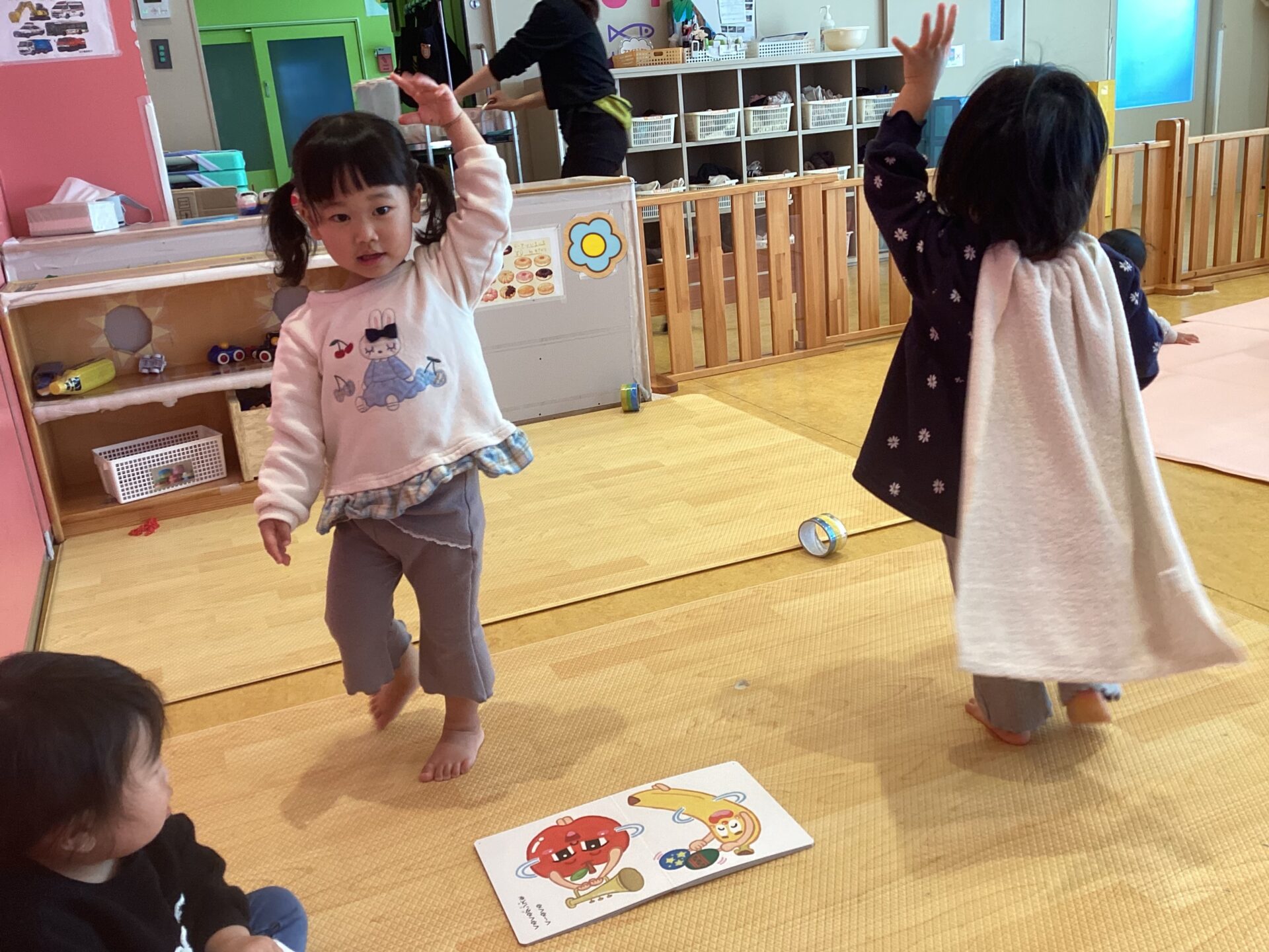 絵本をみながら一緒に歌ったりダンスを楽しむお友だち。