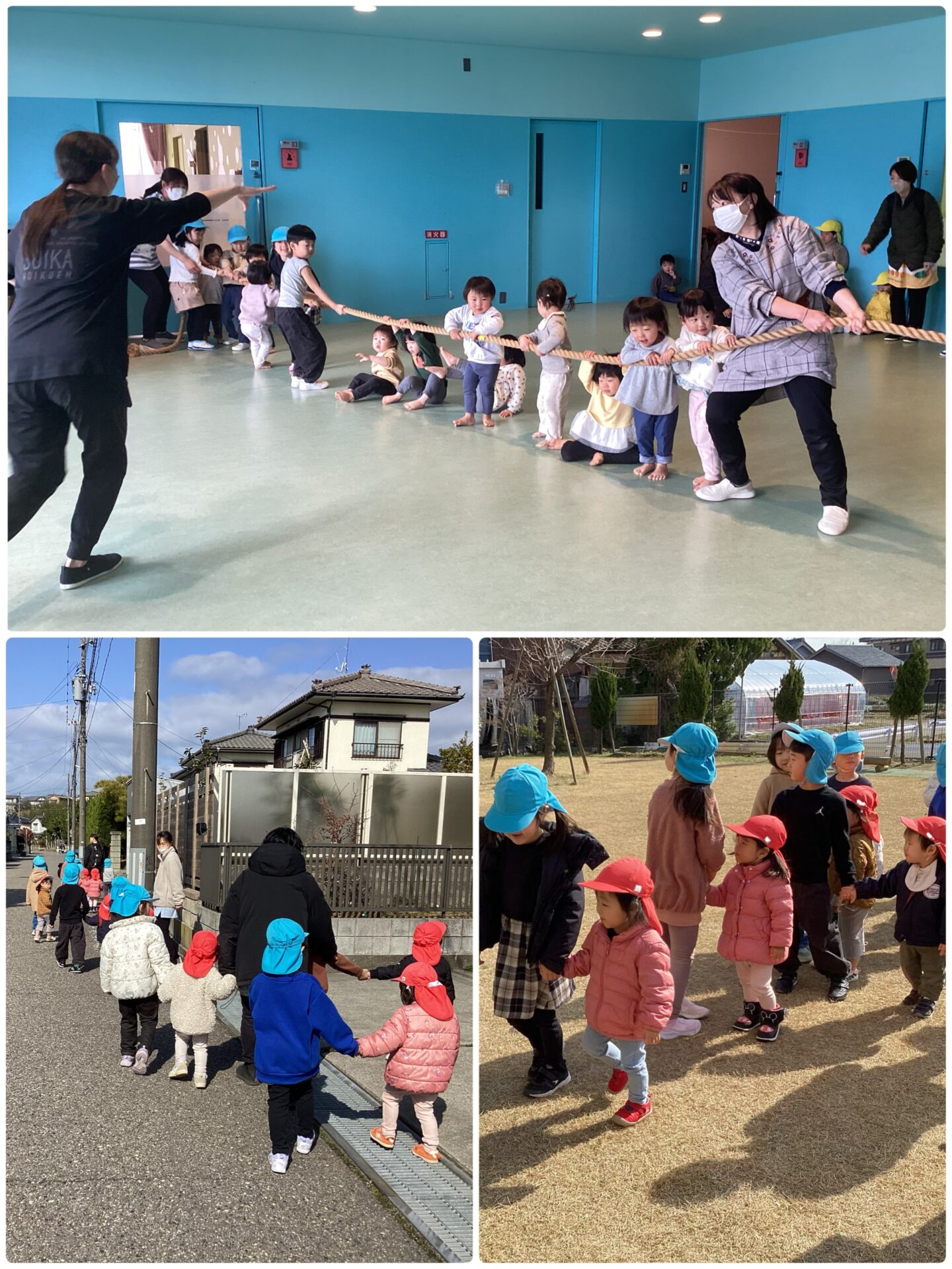 一緒にホールで綱引きをしました。まずは見本を見せてもらいましたが、迫力に圧倒されていたほど…その後の綱引きでは、優しく引っ張ってくれて、うみ組も楽しく参加することができました!