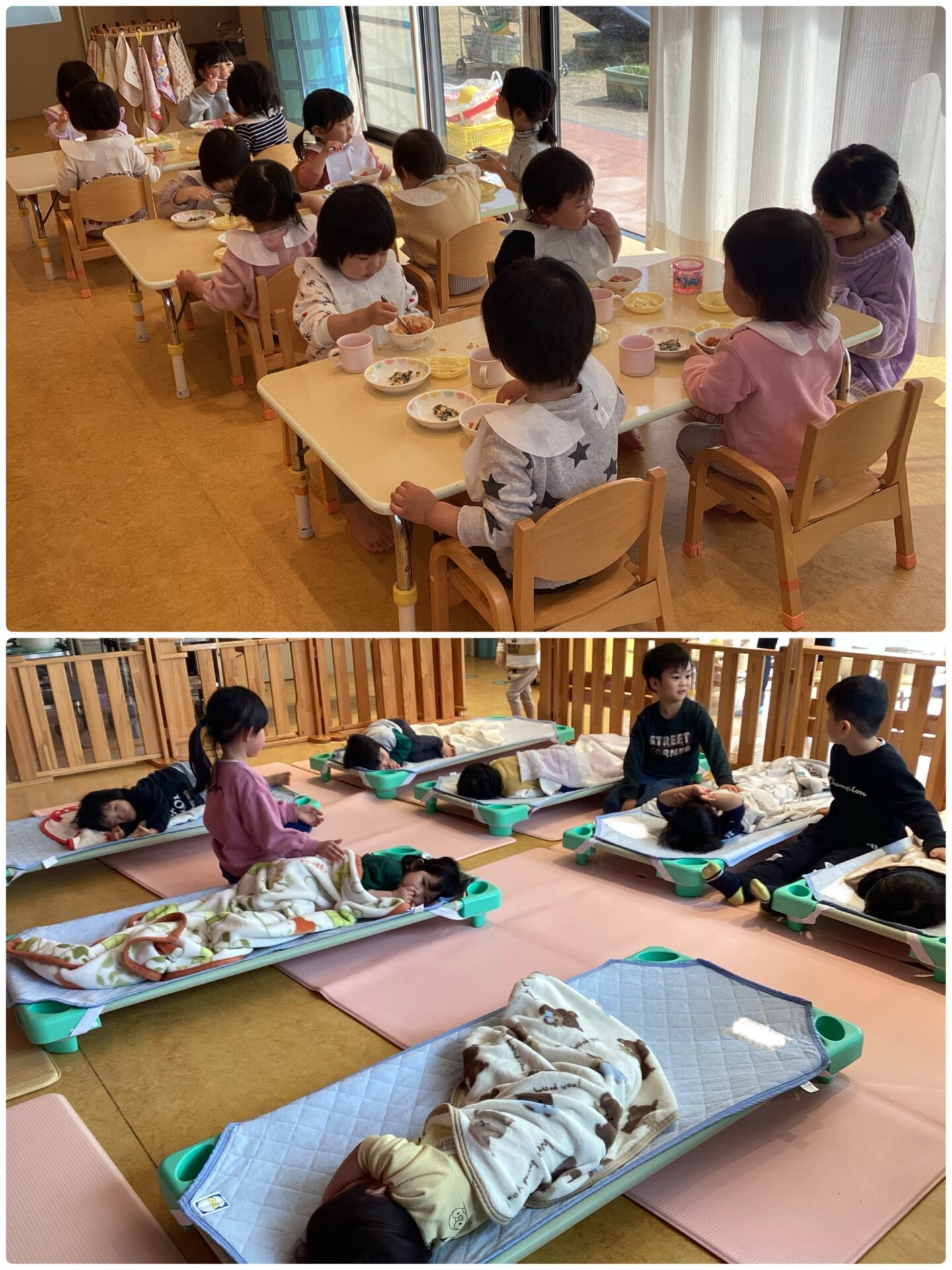 別の日には、一緒に給食も食べました。うみ組のお友だちは、緊張していたお友だちもいましたが、いつもと違う給食の雰囲気にワクワク、ドキドキ。一緒にお昼寝できることも特別な一日となり、とても嬉しそうでした!