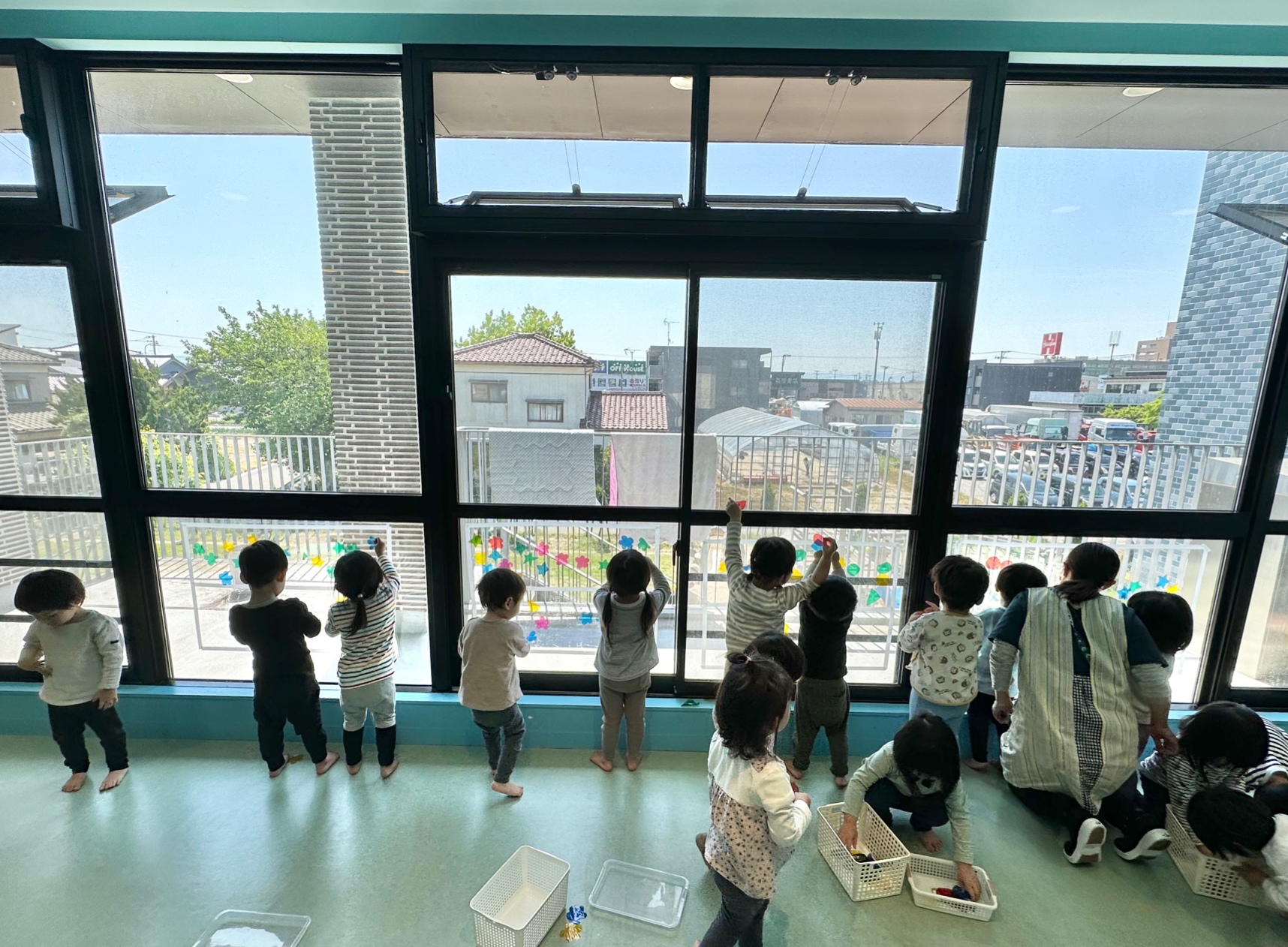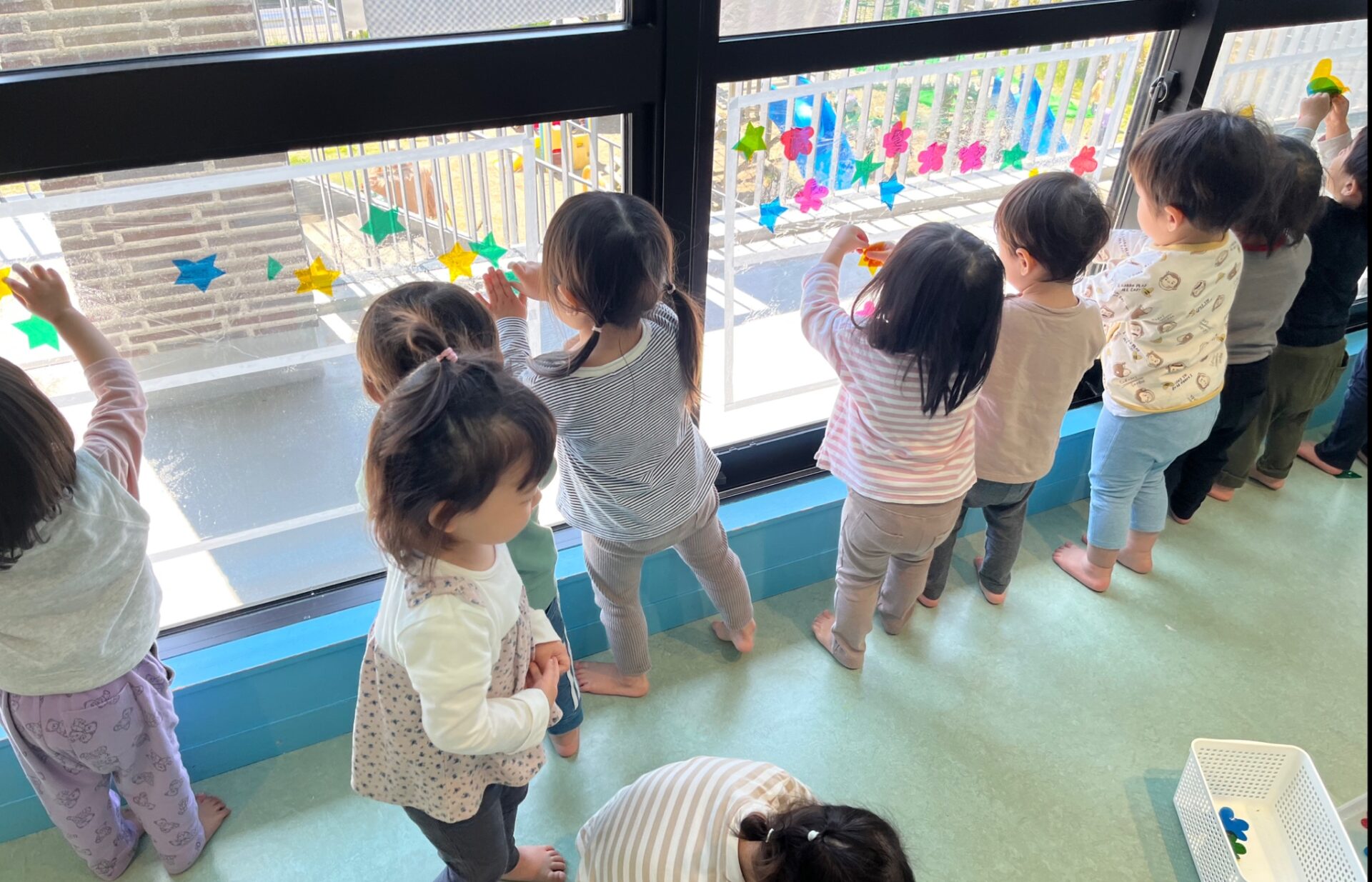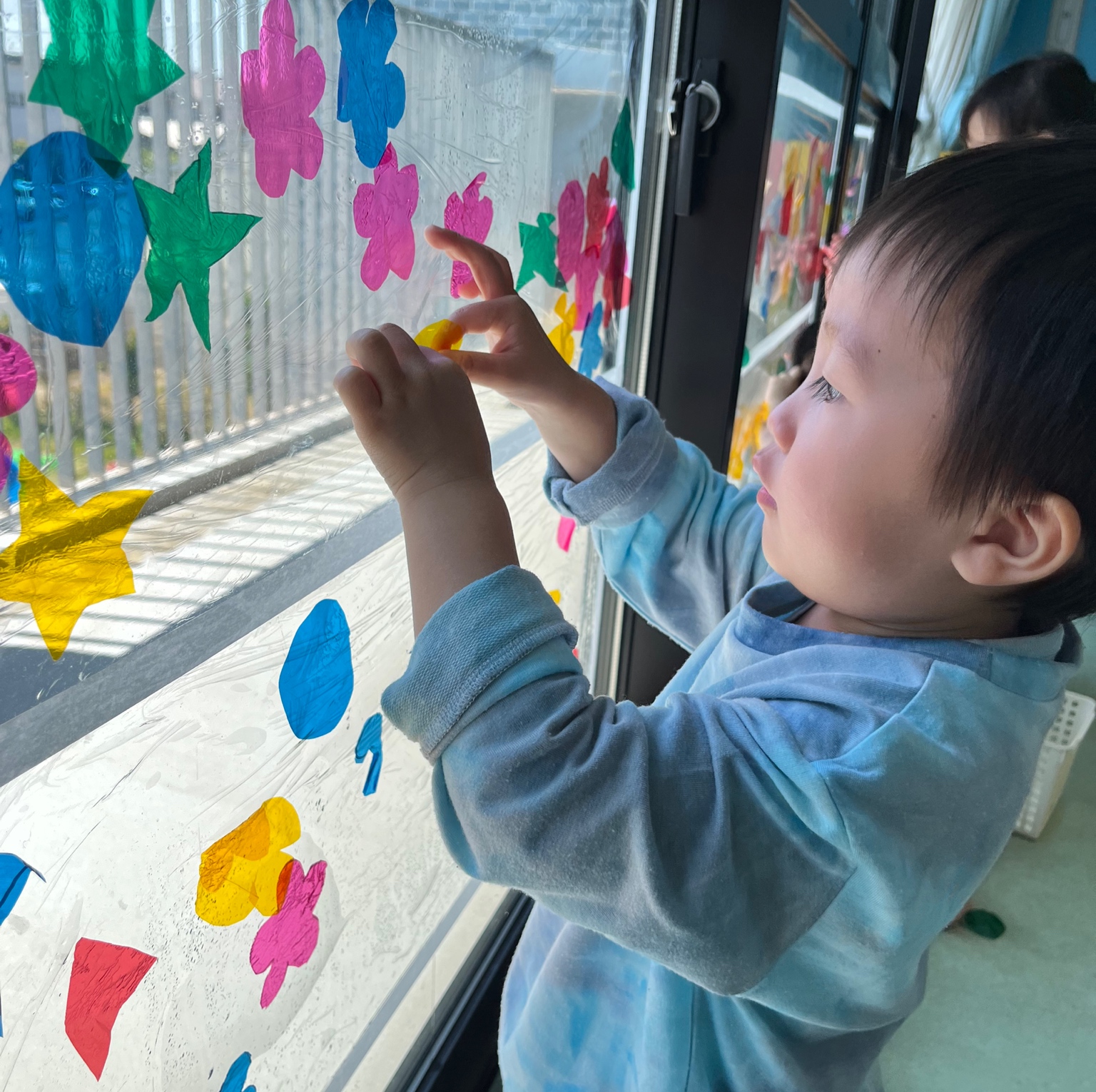 丸や三角、お花、星型等、様々な形に切った色とりどりのカラーセロファンを、大きな窓に貼って楽しむことにしました。