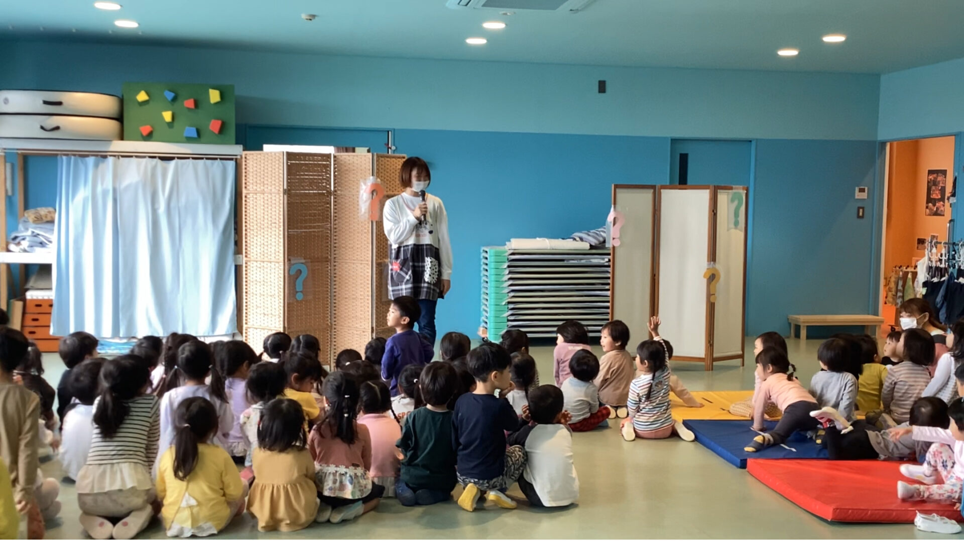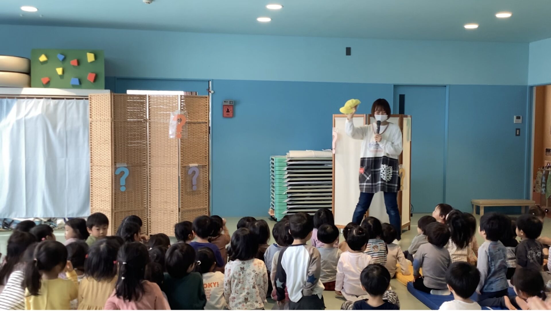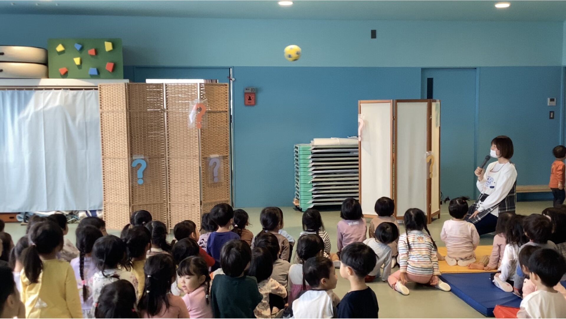 パーテーションとパーテーションの間を、子ども達に馴染みのある物が飛んでいきます!