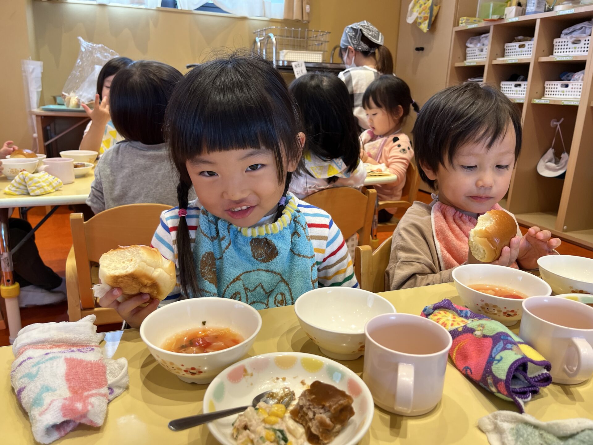 それぞれの食べ方で、給食の時間を楽しみました!