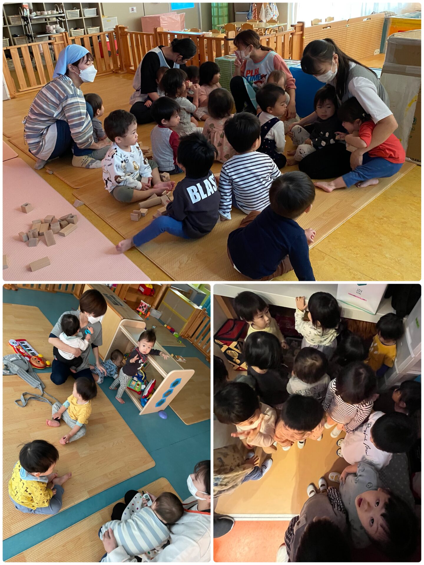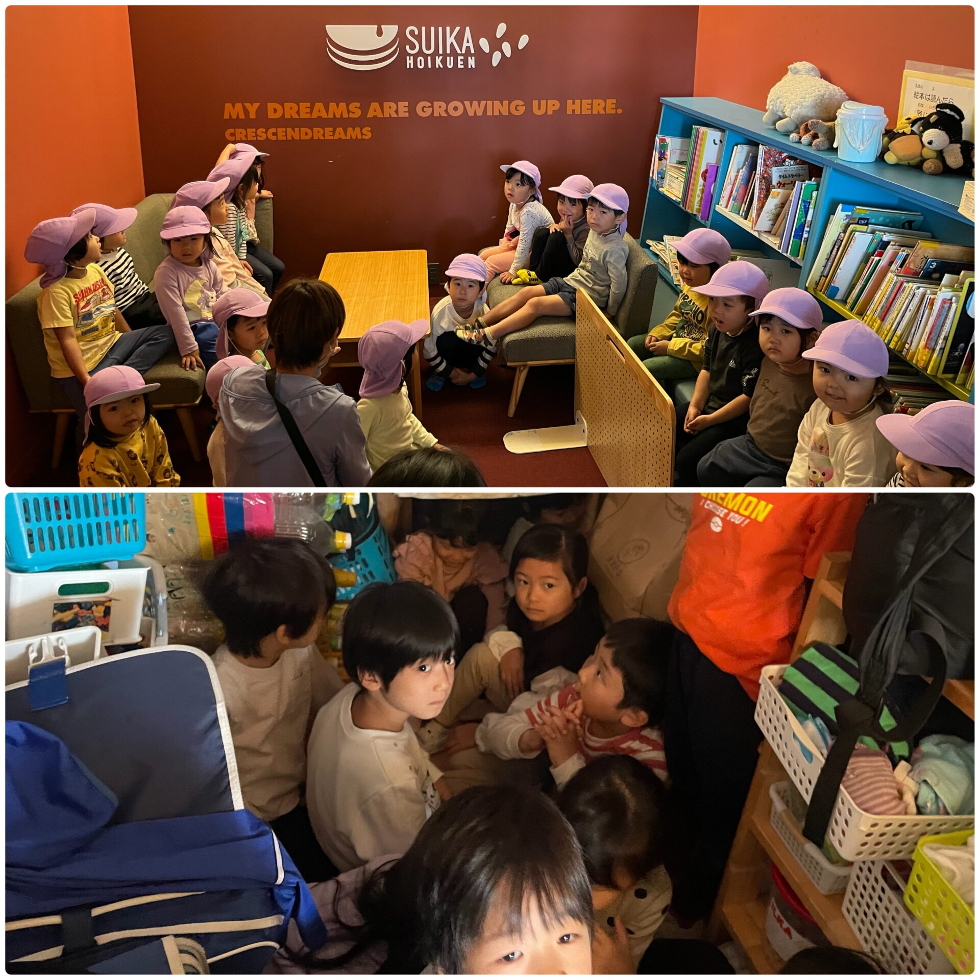 園庭に出ているクラスは、園舎内に入り、近くのお部屋に避難します。