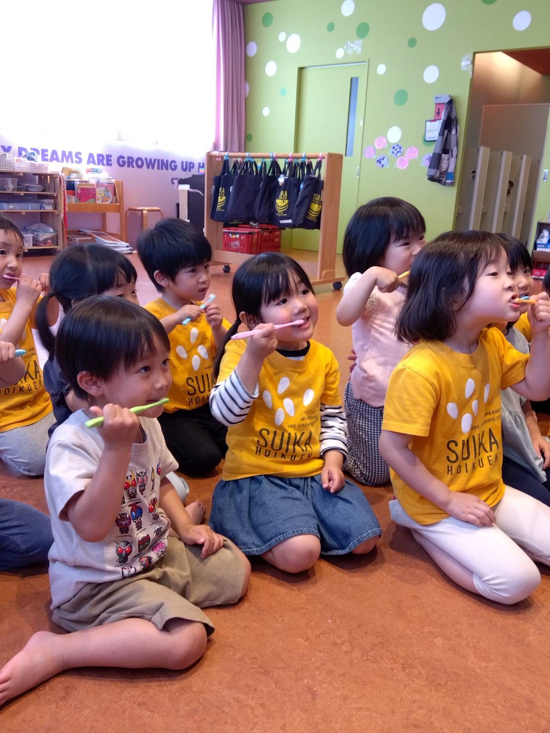 6月から、ゆき組(3歳児)で歯みがきが始まるため、5月30日に“歯みがき講座“を行いました。