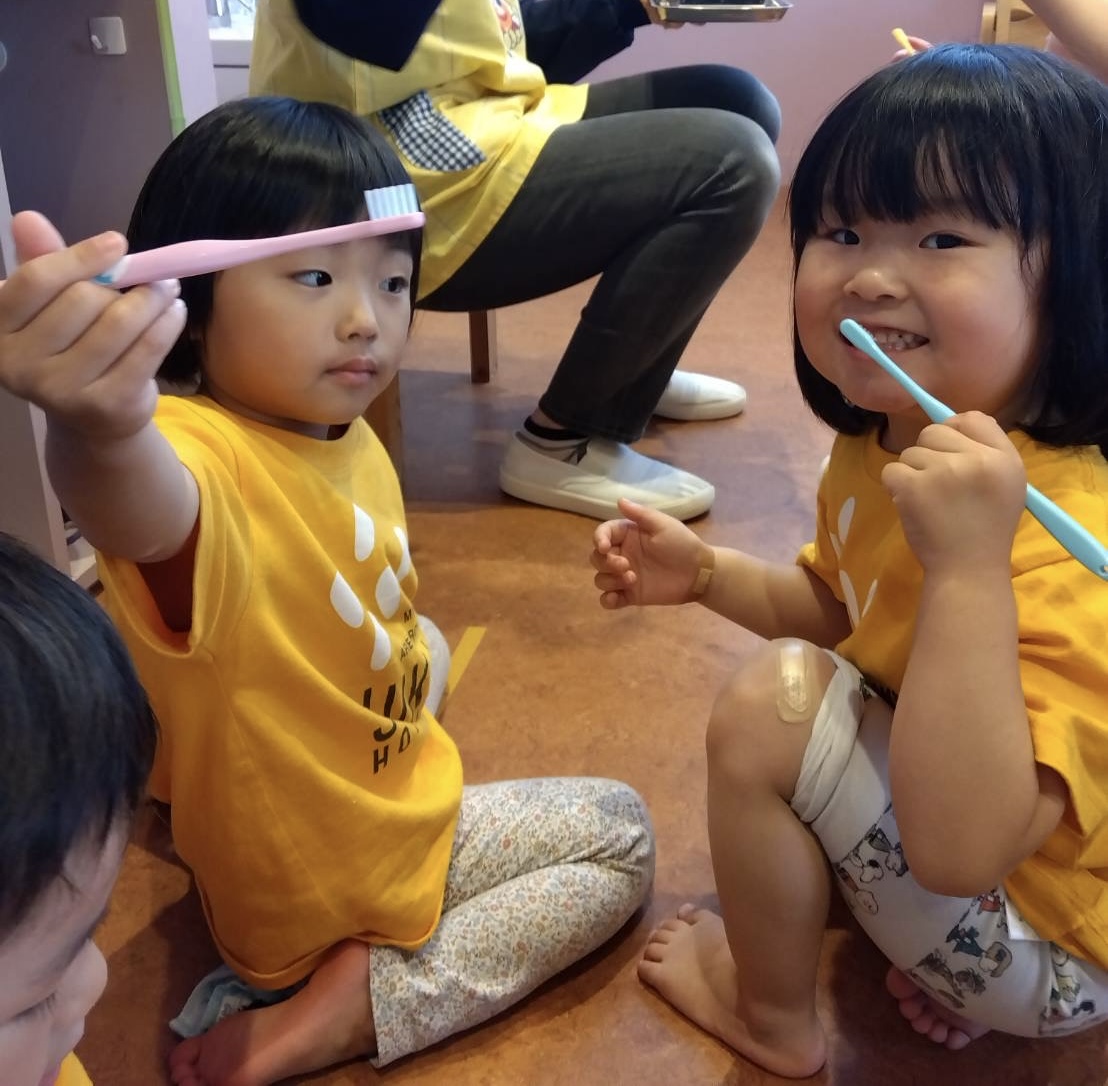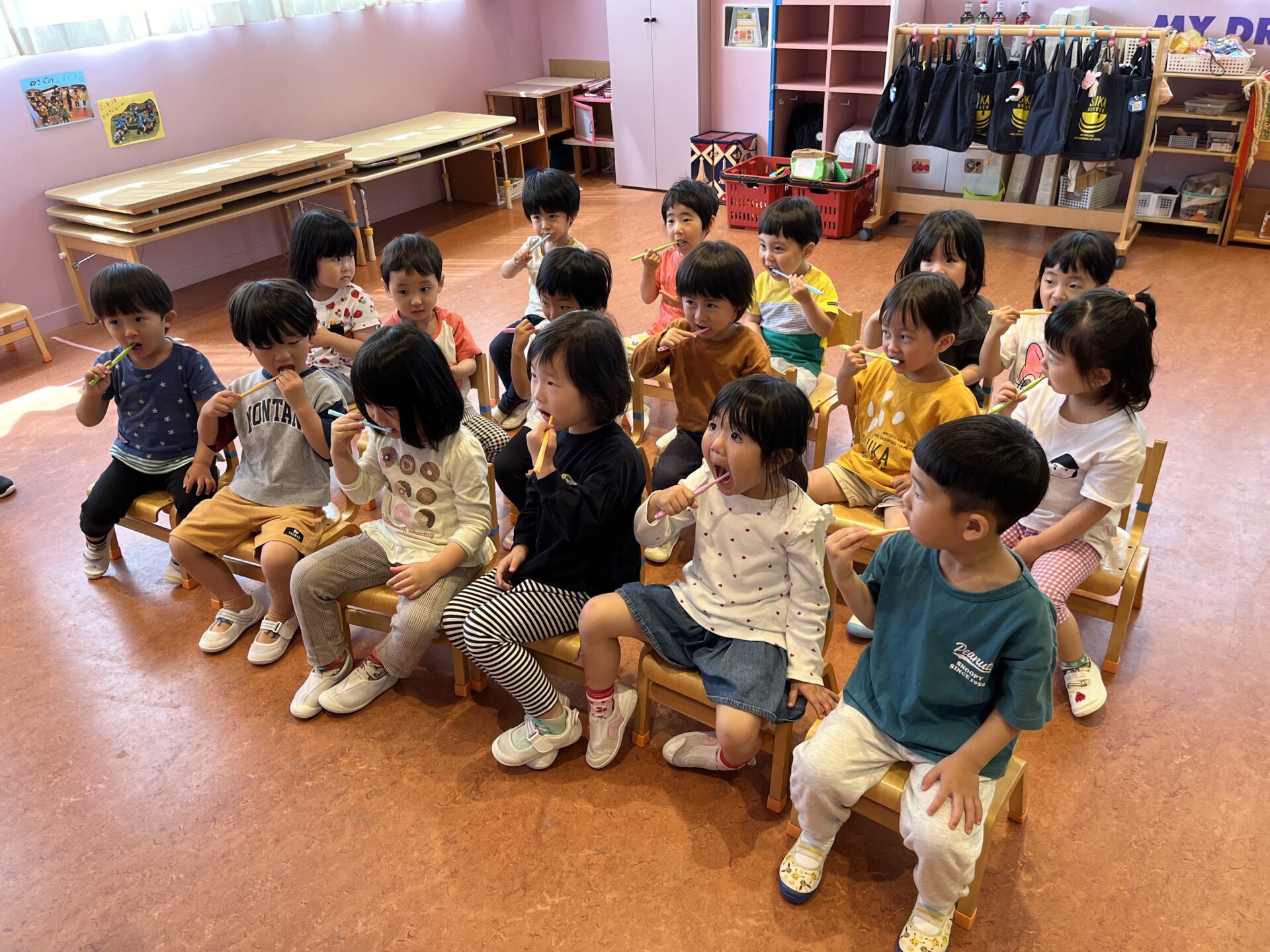 保育者の声かけに合わせて、下の歯、上の歯、奥歯、前歯と優しく丁寧に磨いていました。歯ブラシの持ち方もとても上手でしたよ😊